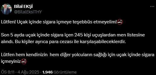 THY Genel Müdürü Bilal Ekşi, sosyal medya hesabından yaptığı paylaşımda son 5 ay içerisinde uçaklarda sigara ve tütün ürünü tüketen 245 kişinin uçuşlardan men edildiğini açıkladı. Ekşi paylaşımında, "Lütfen! Uçak içinde sigara içmeye teşebbüs etmeyelim!