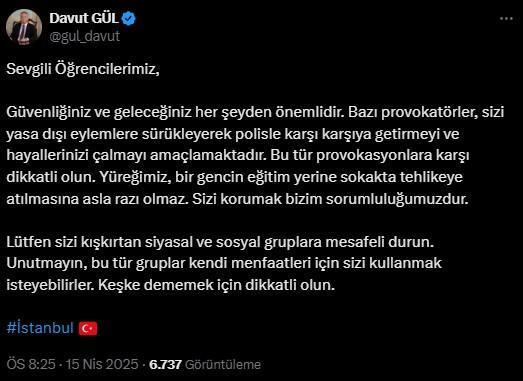 İstanbul Valisi Davut Gül, sosyal medya hesabından bir paylaşım yaparak gençlere uyarılarda bulundu. Vali Gül paylaşımında, "Sevgili Öğrencilerimiz, Güvenliğiniz ve geleceğiniz her şeyden önemlidir. Bazı provokatörler, sizi yasa dışı eylemlere sürükleyerek polisle karşı karşıya getirmeyi ve hayallerinizi çalmayı amaçlamaktadır. Bu tür provokasyonlara karşı dikkatli olun. Yüreğimiz, bir gencin eğitim yerine sokakta tehlikeye atılmasına asla razı olmaz. Sizi korumak bizim sorumluluğumuzdur. Lütfen sizi kışkırtan siyasal ve sosyal gruplara mesafeli durun. Unutmayın, bu tür gruplar kendi menfaatleri için sizi kullanmak isteyebilirler. Keşke dememek için dikkatli olun" ifadelerini kullandı. (DHA)