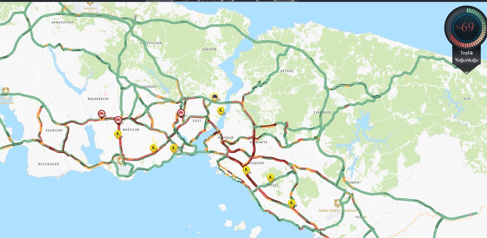 Özgür EREN/İSTANBUL, (DHA)- İSTANBUL'da haftanın ilk iş gününde trafik yoğunluğu oluştu. İBB Trafik Yoğunluk Haritası'na göre trafik yoğunluğu saat 08.15 itibarıyla yüzde 69'a ulaştı. (DHA)