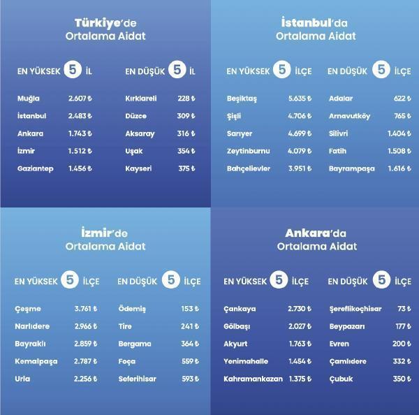 Raporda, İzmir’de ve Ankara’daki ilçelere ilişkin verilere de yer verildi. İzmir’de daire başına aidat ortalaması en yüksek ilçe 3 bin 761 TL ile Çeşme olurken, Çeşme'yi Narlıdere, Bayraklı, Kemalpaşa ve Urla takip etti. Ankara’da ise rekor 2 bin 730 TL ile Çankaya’nın oldu. Çankaya’yı; Gölbaşı, Akyurt, Yenimahalle ve Kahramankazan izledi.