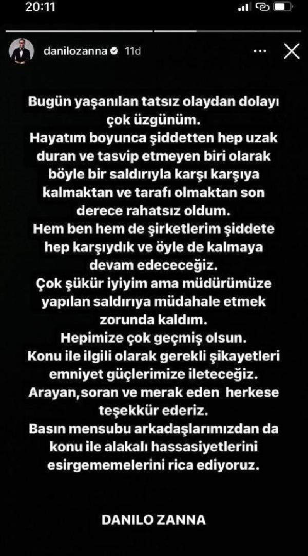 Olayla ilgili sosyal medya hesabı üzerinden açıklama yapan Danilo Zanna; "Bugün yaşanılan tatsız olaydan dolayı çok üzgünüm. Hayatım boyunca şiddetten hep uzak duran ve tasvip etmeyen biri olarak böyle bir saldırıyla karşı karşıya kalmaktan ve tarafı olmaktan son derece rahatsız oldum. Hem ben, hem de şirketlerim şiddete hep karşıydık ve öyle de kalmaya devam edeceğiz. Çok şükür iyiyim ama müdürümüze yapılan saldırıya müdahale etmek zorunda kaldım. Hepimize çok geçmiş olsun. Konu ile ilgili olarak gerekli şikayetleri emniyet güçlerimize ileteceğiz. Arayan, soran ve merak eden herkese teşekkürler" dedi. (DHA)