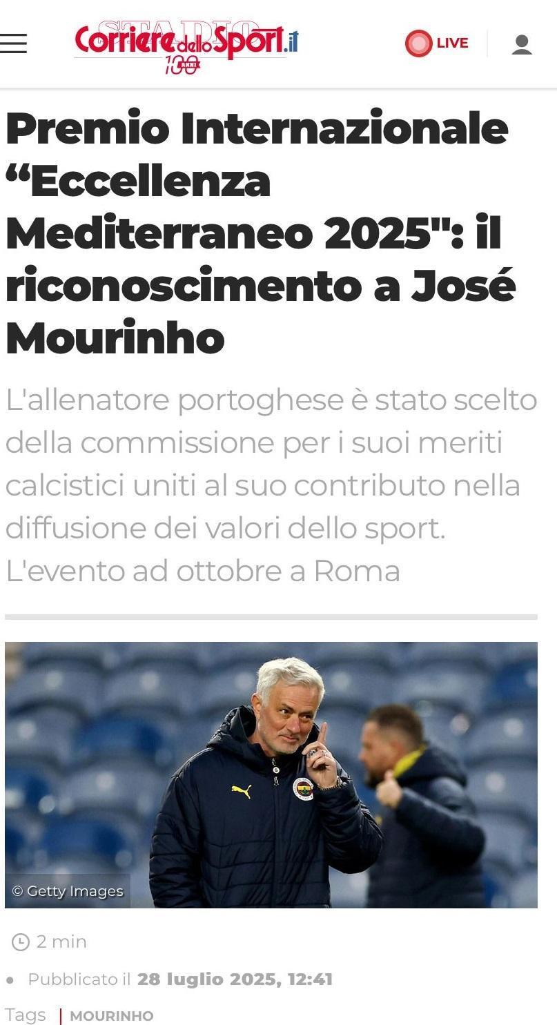 Bu yılki etkinliğin en dikkat çekici konuklarından biri, dünya futbolunun en başarılı ve simgesel teknik direktörlerinden Fenerbahçe Teknik Direktörü Jose Mourinho olacak. Corriere dello Sport'un duyurduğu haberde organizasyon komitesi, Mourinho’ya bu ödülü yalnızca kazandığı sportif başarılar nedeniyle değil, aynı zamanda sporun evrensel değerlerini, kültürel kimliği ve halklar arası diyaloğu yayma konusundaki katkılarından dolayı takdim etmeye karar verildiği belirtildi.