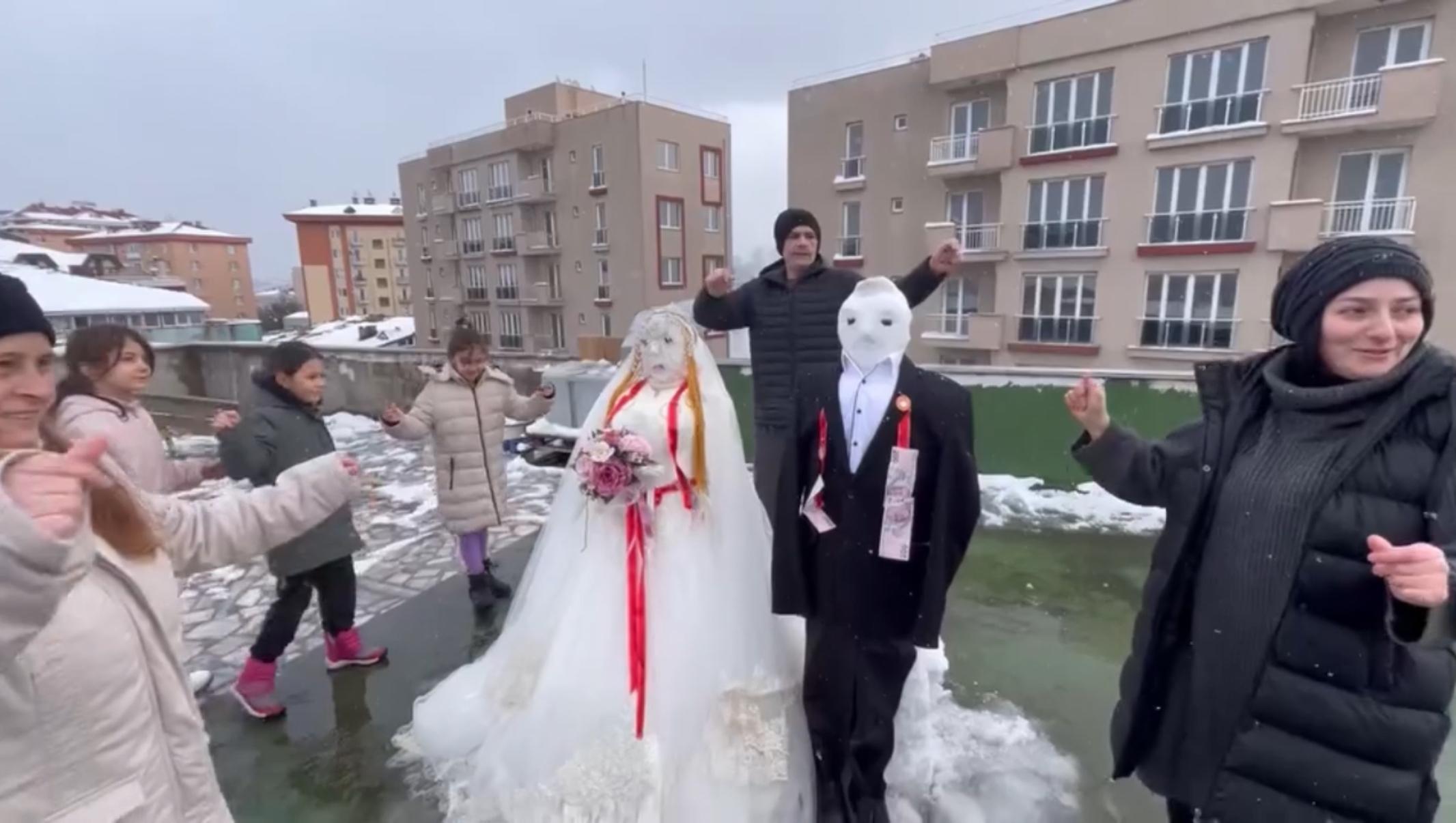 İstanbul’da etkili olan kar yağışı sonrası Kağıthane Hamidiye Mahallesi’ndeki bir binada yaşayan vatandaşlar çatıya çıkarak kardan adam yaptı. Ardından kardan adamlara gelinlik ve damatlık giydiren grup, düğün düzenleyerek eğlendi. Düğünde müzik eşliğinde oynayan vatandaşlar, kardan damat ve geline para taktı. Gelinin eline buket veren grup, eğlendikleri anları cep telefonu kamerasıyla kaydetti.(DHA)