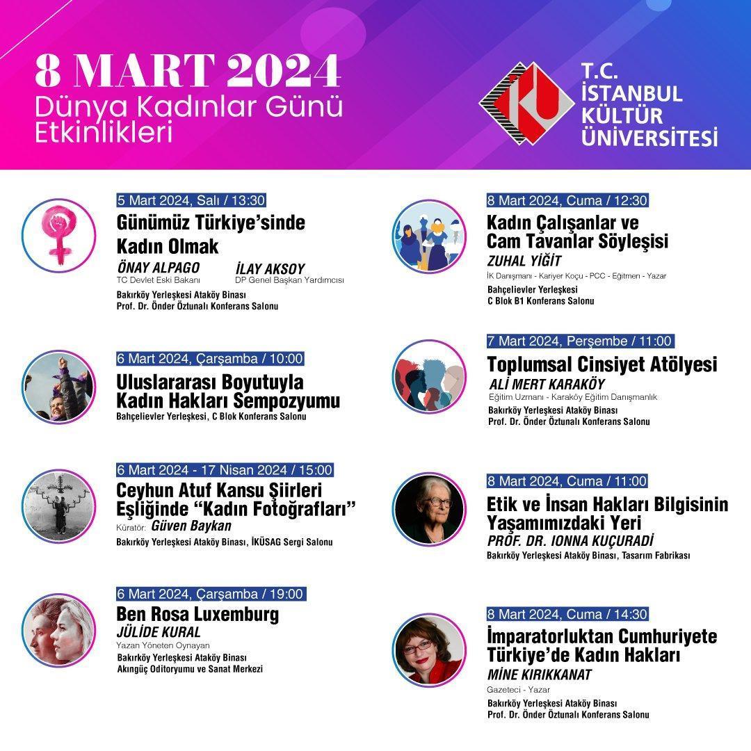 İSTANBUL, (DHA)- Kültür Koleji Vakfı ve İstanbul Kültür Üniversitesi, kadının toplumdaki yerini ve konumunu; tiyatro, edebiyat, felsefe, hukuk başlığında farklı perspektiflerden sunan farkındalık temelli etkinliklerle ele alacak. Üniversitenin etkinlik serisi 5 Mart tarihinde, eski Devlet Bakanı Önay Alpago ve Demokrat Parti Genel Başkan Yardımcısı İlay Aksoy’un konuk olduğu, “Günümüz Türkiye’sinde Kadın Olmak” başlıklı seminerle başlayacak. Üniversitenin Kadın ve Sosyal Araştırmalar Birimi Başkanı Prof. Dr. Işıl Baş’ın moderasyonunda gerçekleşecek etkinliğin ardından 6 Mart tarihinde üniversitenin Hukuk Fakültesi, “Uluslararası Boyutuyla Kadın Hakları” konulu bir sempozyum düzenleyecek.