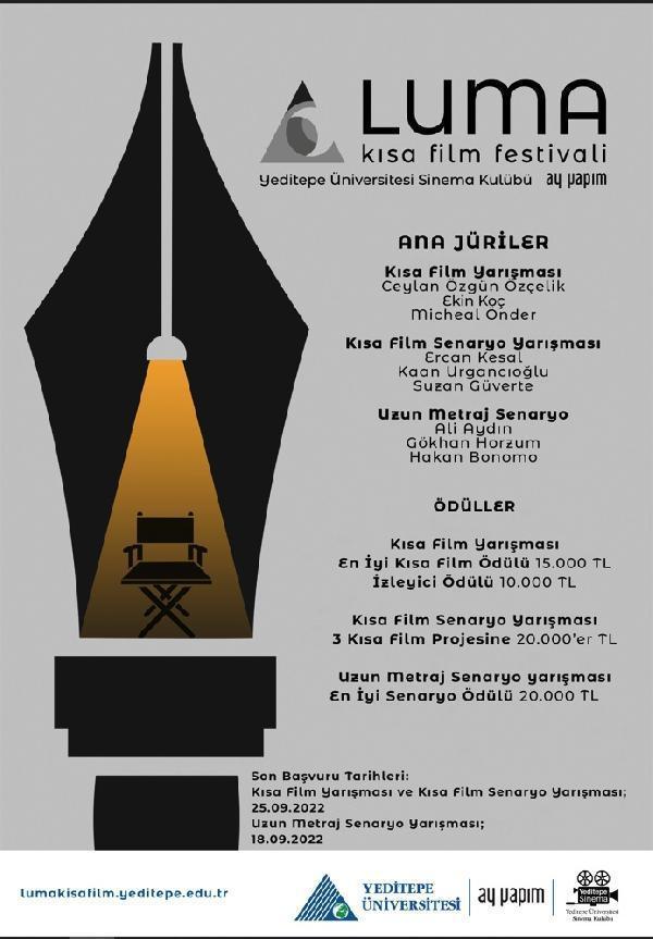 Yeditepe Üniversitesi Sinema Kulübü ve Ay Yapım’ın, hayal ettiği film projelerini gerçekleştirmek isteyen yetenekli gençleri desteklemek amacıyla düzenlediği Luma Kısa Film Festivali’nin ikincisi, 24-27 Ekim tarihleri arasında gerçekleştirilecek. Yalnızca öğrencilerin katılabileceği yarışmada öğrenciler “Kısa Film Yarışması”, “Kısa Film Senaryo Yarışması” ve “Uzun Metraj Film Senaryo Yarışması” olmak üzere üç farklı kategoride yarışacak. “Kısa Film Yarışması” ve “Kısa Film Senaryo Yarışması” başvuruları 25 Eylül Pazar gününe kadar festivalin web sitesi lumakisafilm.yeditepe.edu.tr adresi üzerinden yapılabilecek.
