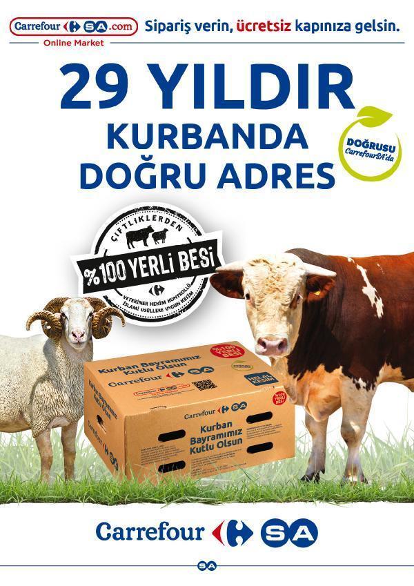 Sabancı Holding ve Carrefour iştiraki CarrefourSA, tamamen hijyenik şartlarda, doğru koşullarda kesim gerçekleştirerek vekâleten ve kaynağı belli, yüzde 100 yerli besi kurbanlık paketleriyle farklı alternatifler sunduğunu açıkladı. Ayrıca bayramın dördüncü günü teslim almak isteyenlere ise indirim fırsatı tanındığı bildirildi.