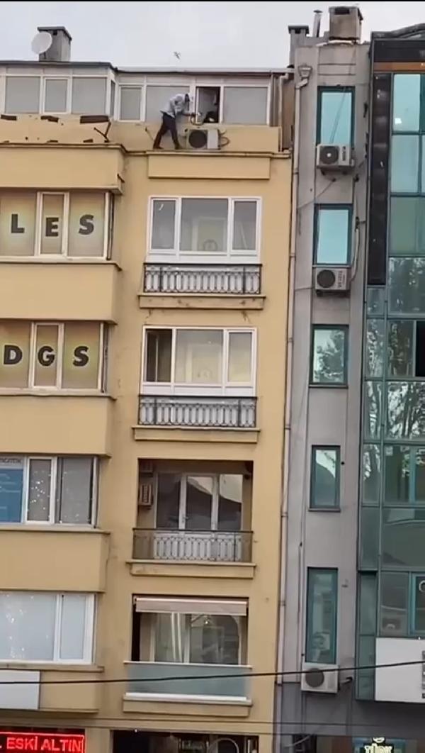 Cengiz ÇOBAN/İSTANBUL,(DHA)KADIKÖY’de bir işçi 6 katlı bir binanın en üst katında hiçbir güvenlik önlemi almadan çalıştı.İşçinin klima tamiri yaptığı anlar cep telefonu kamerasıyla kaydedildi.