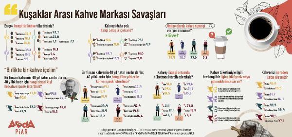 İSTANBUL, (DHA) - Areda Piar araştırma şirketi Dünya Türk Kahvesi Günü'nün 10. yıldönümünde, Türkiye genelinde bin 100 kişinin katılımı bir araştrırma yaptı. Araştırmada Türkiye'deki kahve kültürü kuşaklara göre ele aldı. Araştırmaya göre tüm kuşakların ortak tercihi olan Türk Kahvesini yüzde 76,1 ile en çok tüketen ve yüzde 81 ile en çok keyif alan kuşak Baby Boomers oldu. Türk kahvesinden sonra en çok tüketilen kahve türleri filtre kahve, americano, üçü bir arada, sütlü köpüklü ve menengiç olmak üzere kuşaklara göre değişkenlik gösterdi. Birlikte kahve içmek istenilen siyasetçi Recep Tayyip Erdoğan olurken, film yıldızı kategorisinde ise Türkan Şoray yer aldı.