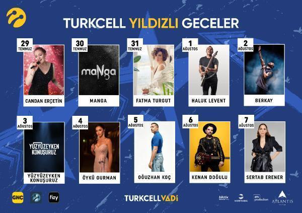Müzikseverler için bir yaz klasiğine dönüşen Yıldızlı Geceler konserleri, bu yıl 29 Temmuz’da Candan Erçetin’in performansıyla başlayacak ve Vadistanbul, SM Production & Atlantis Yapım iş birliğiyle Turkcell Vadi’de gerçekleştirilecek. 7 Ağustos’a kadar art arda yapılacak konserler Candan Erçetin, MaNga, Fatma Turgut, Haluk Levent, Berkay, Yüzyüzeyken Konuşuruz, Öykü Gürman, Oğuzhan Koç, Kenan Doğulu ve Sertab Erener ile devam edecek.