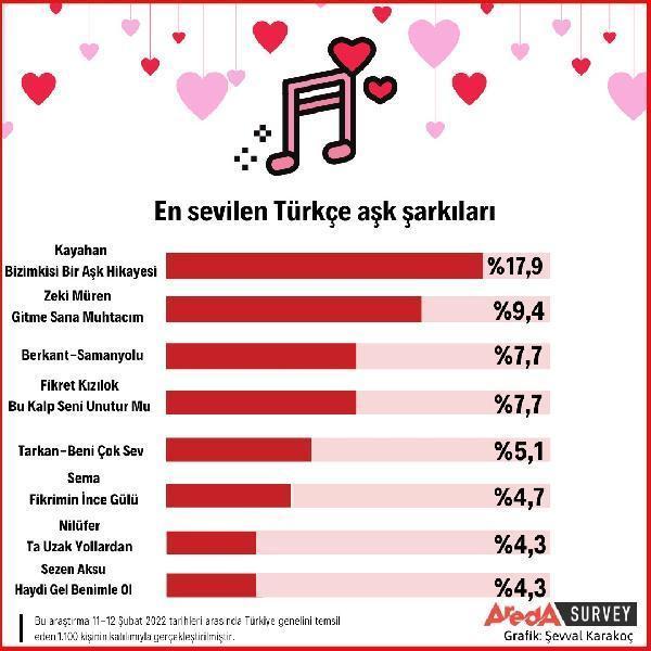 Sevgililer Günü yaklaşırken planlar ve hediyeler kadar romantik şarkılar da önem kazanıyor. Bazı şarkılar üzerinden yıllar geçse de etkisini yitirmiyor, tam tersine durdukça demleniyor. Çünkü o şarkılarda anılar, sevinçler, hüzünler birikiyor. Araştırma şirketi Areda Survey, Gelmiş geçmiş en sevilen Türkçe aşk şarkılarına yönelik bir araştırma yaptı. Araştırmaya göre Kayahan’ın “Bizimkisi Bir Aşk Hikayesi” adlı şarkısı yüzde 17,9 oranla birinci sırada yerini aldı. Araştırmada ikinci sıraya Zeki Müren’in Gitme Sana Muhtacım, üçüncü sıraya da Berkant’ın Samanyolu adlı şarkısı yerleşti.
