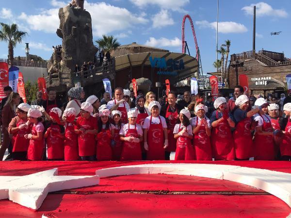 İSTANBUL, (DHA)- Tuzla’da çocuklar 29 Ekim Cumhuriyet Bayramı’nın 99’uncu yıl dönümüne özel, 100 parçadan oluşan 24 metrekarelik pastayı birleştirerek Türk bayrağı oluşturdu. Etkinlik kapsamında birleştirilen pasta, ‘Pastadan yapılan en büyük bayrak’ kategorisi ile Guinness Çocuk Rekoru kitabındaki yerini aldı.