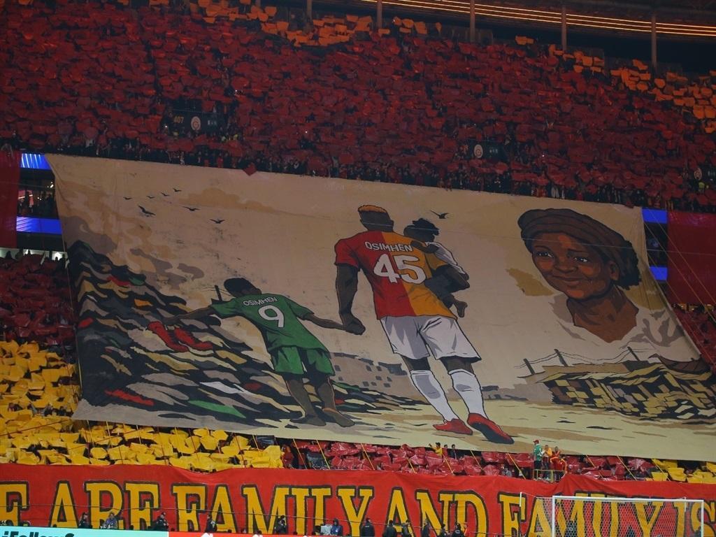 Sarı-kırmızılı taraftar grubu ultrAslan, Nijeryalı golcü Victor Osimhen için özel bir koreografi hazırladı. Tribünlerde açılan dev görselde Osimhen’in hayat hikayesine gönderme yapan etkileyici bir tasarım yer aldı. Görselde yıldız futbolcunun annesinin fotoğrafı bulunurken, Osimhen’in bir elinde çocukluk hali, diğer elinde ise kendi çocuğu yer aldı.