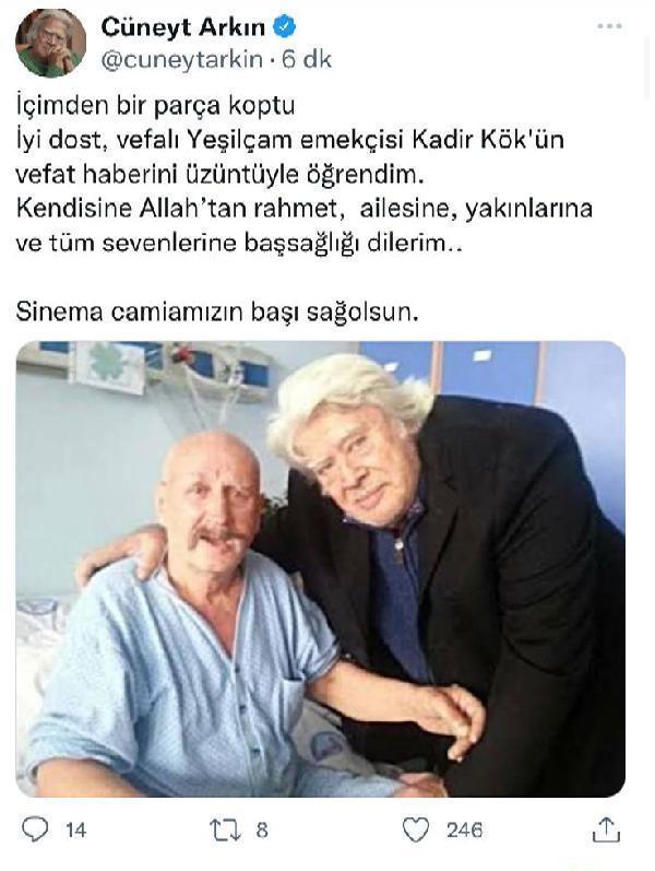 Türk Sineması'nda yüzlerce filmde rol alan 83 yaşındaki Kadir Kök hayatını kaybetti. Oyuncunun ölüm haberini Cüneyt Arkın duyurdu. Sosyal medya hesabından Kök ile birlikte çekilen fotoğrafını paylaşan Arkın, "İçimden bir parça koptu. İyi dost, vefalı Yeşilçam emekçisi Kadir Kök'ün vefat haberini üzüntüyle öğrendim. Kendisine Allah'tan rahmet, yakınlarına ve sevenlerine baş sağlığı diliyorum" ifadelerini kullandı.