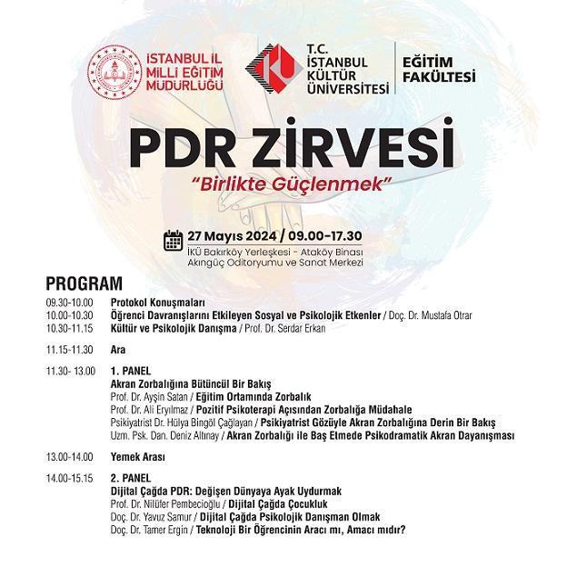 İSTANBUL,(DHA)- İstanbul İl Milli Eğitim Müdürlüğü ve İstanbul Kültür Üniversitesi Eğitim Fakültesi’nin birlikte düzenlediği Psikolojik Danışma ve Rehberlik (PDR) Zirvesi “Birlikte Güçlenmek” teması ile 27 Mayıs'ta Kültür Üniversitesi Akıngüç Oditoryumu ve Sanat Merkezinde gerçekleşecek. Zirvede ‘Akran Zorbalığı’ ve ‘Dijital Çağda PDR Uygulamaları’ konuları ele alınacak. Ayrıca zirve kapsamında atölye çalışmaları da yapılacak.