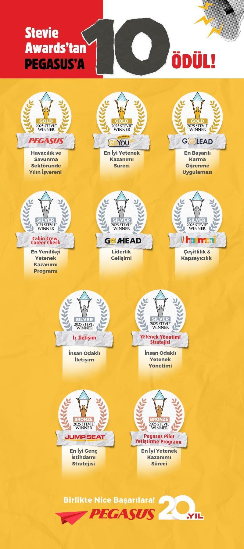 Şirket, bu yılki ödüllerde üçü altın, beşi gümüş ve ikisi bronz olmak üzere toplam 10 ödül kazandı. Havacılık ve savunma sektöründe ‘Yılın İşvereni’ seçilen Pegasus, aynı zamanda genç yetenekleri işe alım ve geliştirme süreçlerine yönelik özgün uygulamalarıyla takdir topladı. Genç yetenek kazanımı alanında yürütülen ‘GoYoung’ programı ve güçlü karma öğrenme yaklaşımıyla tasarlanan ‘GoLead’ liderlik programı altın ödüle layık görüldü.