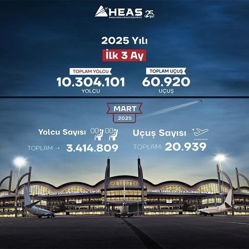 İbrahim YILDIZ/İSTANBUL, (DHA)- İSTANBUL Sabiha Gökçen Havalimanı, 2025 yılı Ocak ve Mart aylarını kapsayan ilk çeyrek verilerine göre söz konusu dönemde 10,3 milyon yolcuya hizmet ederken, toplam uçuş sayısı 60 bin 920 oldu.