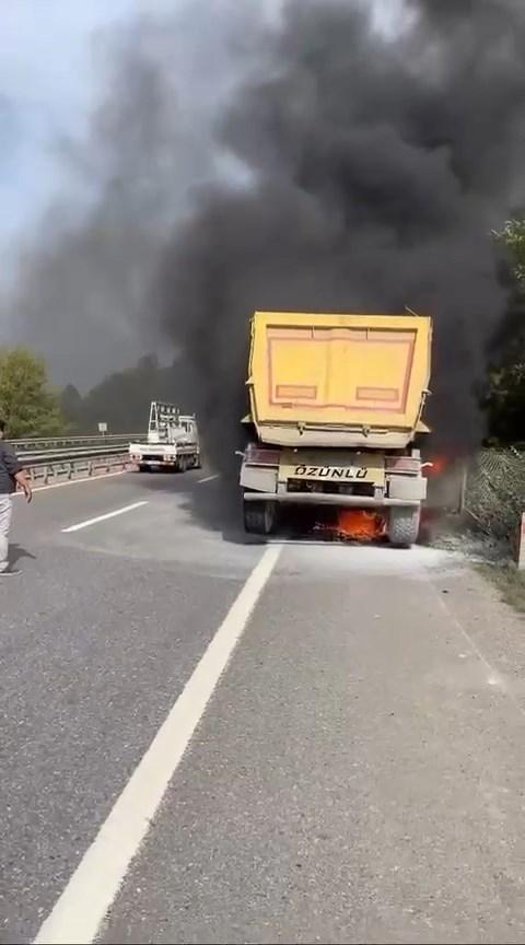 İsa ALMAÇAYIR-Hiba HAKBİLİR/İSTANBUL,(DHA)-ŞİLE yolunda seyir halindeki hafriyat kamyonunun lastiklerinden alevler yükselmeye başladı. Alevler kısa sürede kamyonun dorsesini sardı. İtfaiye ekiplerinşn söndürdüğü yangın cep telefonu kamerasıyla kaydedildi.