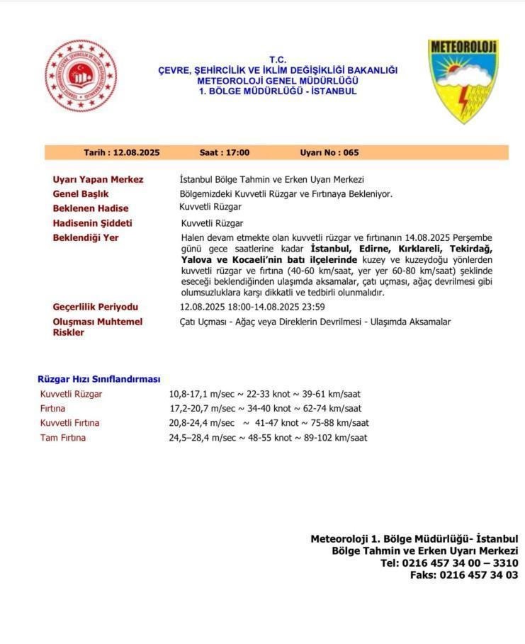 Meteoroloji Genel Müdürlüğü, İstanbul ve çevre iller için kuvvetli rüzgâr ve fırtına uyarısında bulundu. Konuyla ilgili İstanbul Valiliğinden yapılan açıklamada, "Bölgemizde kuvvetli rüzgâr ve fırtına bekleniyor. Meteoroloji Genel Müdürlüğü’ne göre; halen devam etmekte olan kuvvetli rüzgâr ve fırtınanın 14.08.2025 Perşembe günü gece saatlerine kadar İstanbul, Edirne, Kırklareli, Tekirdağ, Yalova ve Kocaeli’nin batı ilçelerinde kuzey ve kuzeydoğu yönlerden kuvvetli rüzgâr ve fırtına (40-60 km/saat, yer yer 60-80 km/saat) şeklinde eseceği bekleniyor. Ulaşımda aksamalar, çatı uçması ve ağaç devrilmesi gibi olumsuzluklara karşı dikkatli ve tedbirli olunmalıdır" ifadeleri yer aldı.