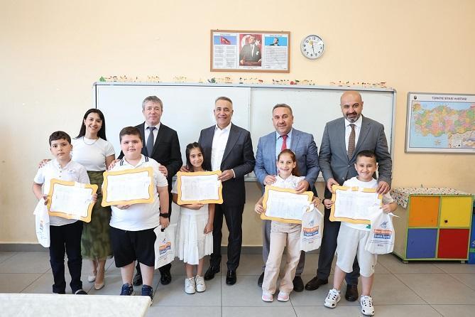 Öğrencileri sınıfında ziyaret eden Başkan Dursun, İlçe Milli Eğitim Müdürü Necati Tekbaş, okul müdürleri ve öğretmenlerle birlikte çocukların karnelerini takdim etti. Öğrencilerle aynı sırayı paylaşarak sohbet etti.