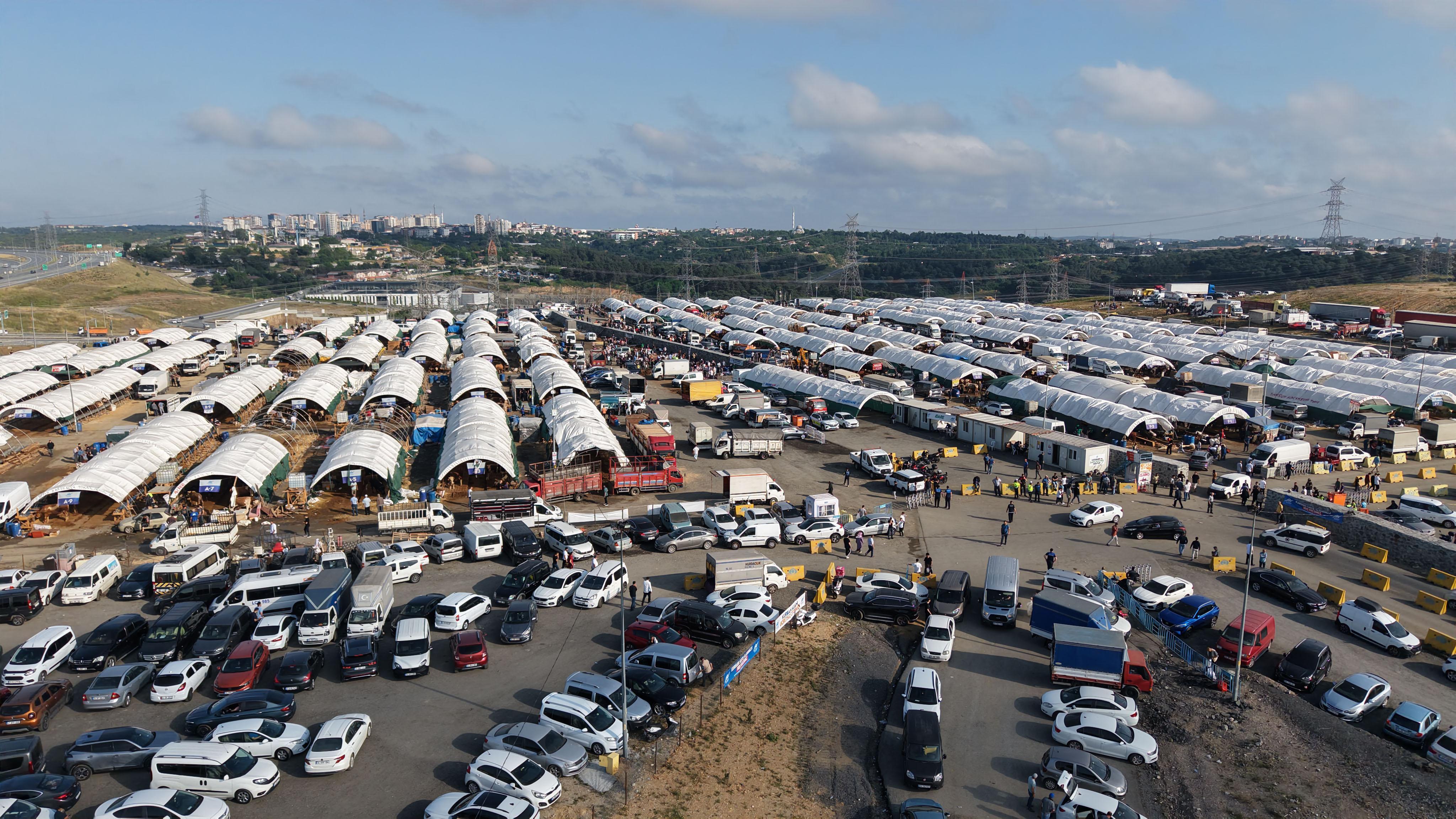 Bayram namazının ardından kurbanlarını kestirmek gelenler Kurban satış merkezleri girişlerinde kilometrelerce araç kuyrukları oluşturdu. İstanbul’un en büyük kurban satış merkezlerinden biri olan Sultangazi Kurban Satış Merkezi'nde sabahın erken saatlerinde uzun araç kuyruğu oluştu. Vatandaşlar saatlerce bekledikten sonra Kurban Satış Merkezine girerek daha önceden satın aldıkları kurbanlarını teslim aldı. İçerisinde de aynı yoğunluğun devam ettiği Kurban Satış Merkezi havadan görüntülendi. (DHA)