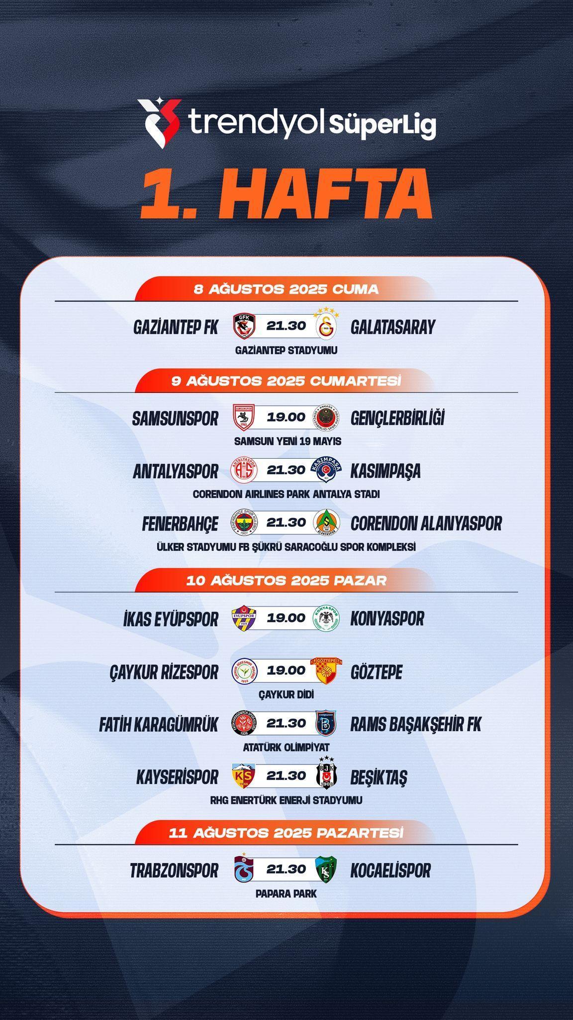 İSTANBUL,(DHA)- SÜPER Lig’de 8 Ağustos Cuma günü başlayan 2025-26 sezonunun ilk 2 haftasında oynanacak maçların programları açıklandı. Ligin açılış karşılaşmasında son şampiyon Galatasaray 8 Ağustos Cuma günü deplasmanda Gaziantep FK’nın konuğu olacak. Fenerbahçe ise ligin ilk mücadelesinde 9 Ağustos Cumartesi günü sahasında Alanyaspor’u konuk edecek. Beşiktaş ise 10 Ağustos Pazar günü Kayserispor deplasmanında olacak.