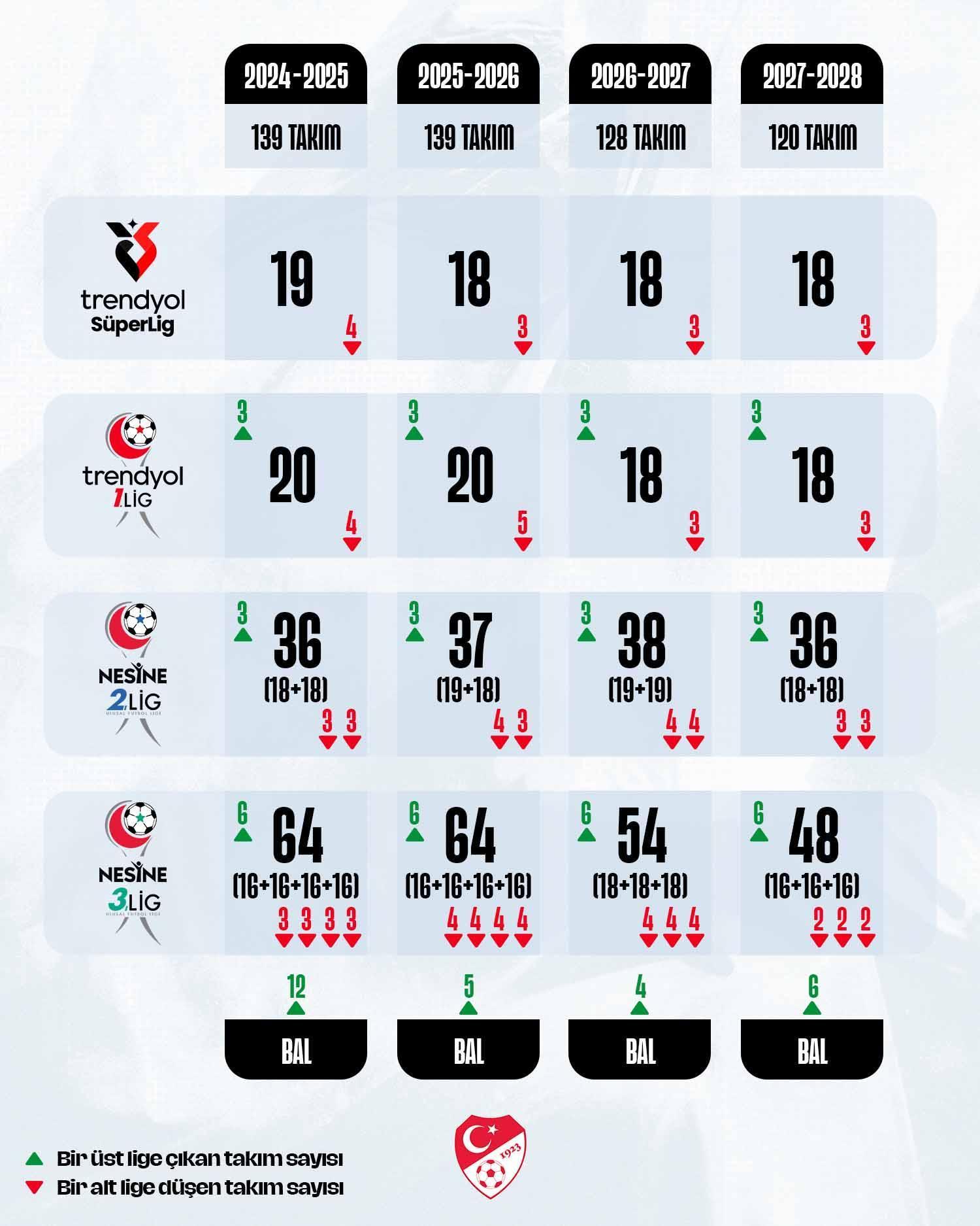Kulüp gelirlerinin artırılması ve daha güçlü bir rekabet ortamı oluşturulması amacıyla, 2025-2026 sezonunda 139 takımın mücadele edeceği profesyonel liglerdeki takım sayısının kademeli olarak azaltılmasına gidilecektir ve hâlihazırda 139 olan profesyonel takım sayısı, aşağıdaki görselde sezonlara göre belirtilen düşme ve çıkma sayılarına göre 120'ye düşürülecektir."