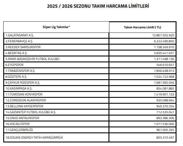 TFF tarafından açıklanan harcama limitleri şöyle: