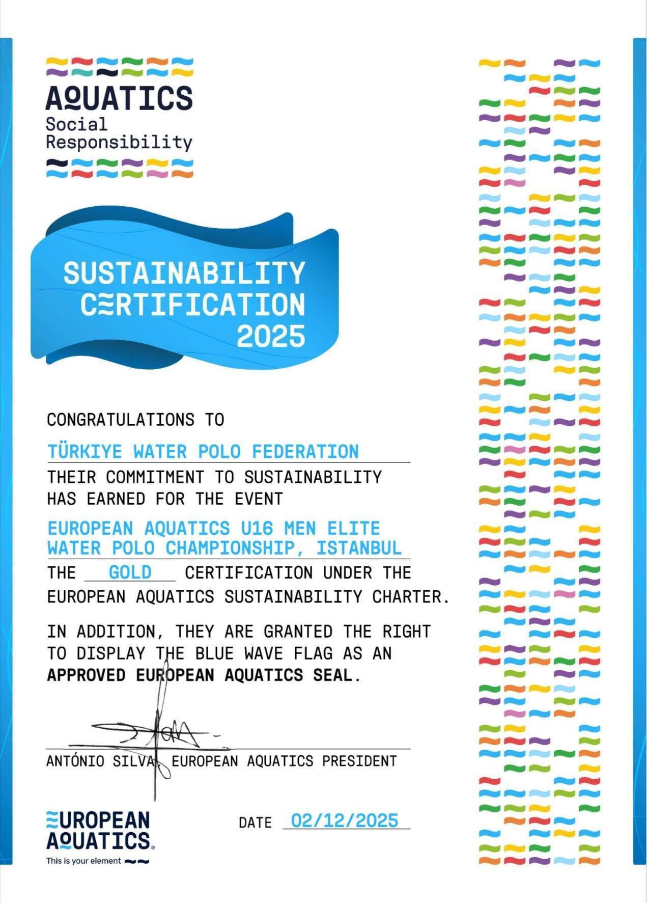 Federasyon, şampiyonalar boyunca çevresel, sosyal ve organizasyonel sorumluluklara olan güçlü bağlılığı sayesinde, European Aquatics Sürdürülebilirlik Şartı kapsamında en üst seviye olan ALTIN (GOLD) Sertifika almaya hak kazandı.