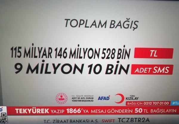 Ardından başlatılan bağış kampanyasına yurt içi ve yurt dışından milyonlarca kişi bütçeleri ölçüsünde katkı sağladı. İş insanından kumbarasındaki parasını depremzedeler için bağışlayan gönüllülere kadar herkesin seferber olması, organizasyonda yer alan gönüllüleri de duygulandırdı. Dün akşam saat 20.00'de başlayan ve saat 02.00'de sonlandırılması planlanan organizasyon, bağış yapmak için arayanların yoğun talepleri nedeniyle uzatıldı. Sabahın ilk ışıklarına kadar devam eden kampanya süresince telefonla bağlanarak yapılan bağışlarda 115 milyar 146 milyon 528 bin lira, SMS ile yapılan bağışlarda ise 9 milyonun üzerinde SMS ile milyonlarca lira toplandı. Rekor düzeydeki bu bağışlar ile Türk halkı zor durumlarda birlik ve dayanışma örneği sergiledi. (DHA)