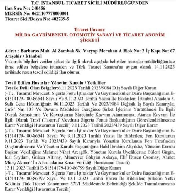 TMSF KAYYUM OLARAK ATANAN İSİMLER TİCARET SİCİL GAZETESİ'NDE YAYIMLANDI