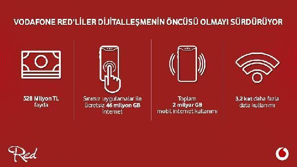 İSTANBUL, (DHA) - Vodafone Red müşterileri, dijitalleşmeye dayalı kullanım alışkanlıkları ve özel Vodafone Red faydaları ile son 1 yılda toplam 528 milyon TL’lik ayrıcalıktan yararlandı. Bu süreçte müşterilerin, tarifelerinde bulunan sınırsız uygulamalar sayesinde en popüler uygulamalarda toplam 46 milyon GB interneti ek ücret ödemeden kullandığı bildirildi.