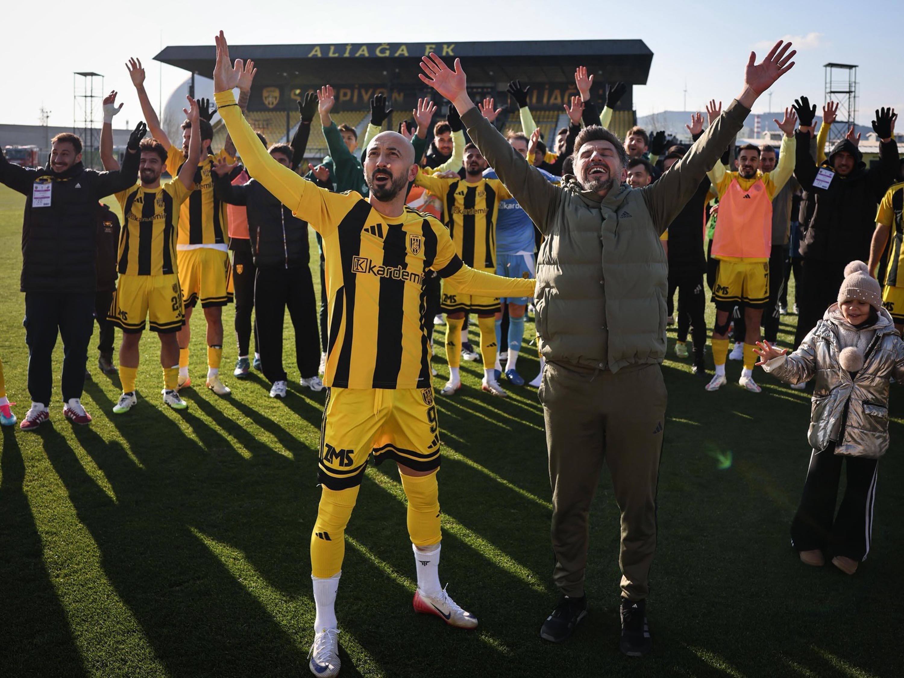İZMİR, (DHA)- 2'nci Lig Kırmızı Grup’ta geçen hafta ligden çekilen Yeni Mersin İdman Yurdu'yla oynaması gereken maçta hükmen 3-0 galip ilan edilen Aliağa Futbol son 9 maçta 2'si hükmen 8'inci galibiyetini alarak şampiyonluk yarışında iddialı bir konuma geldi. 9 maçlık yenilmezlik serisi yakalayan İzmir ekibi bu periyotta sadece 1 beraberlik alarak 28 puan topladı. 18'inci haftada 7'nci sırada yer alan Aliağa FK 56 puana ulaşarak 3'üncü sıraya yükseldi. Lider Bursaspor'u 7, 2'nci Kahramanmaraş İstiklalspor'u da 1 puan geriden takip eden Aliağa FK, kalan 7 maç öncesi taraftarına umut aşıladı. Teknik direktör Polat Çetin sonuna kadar zirveyi kovalayacaklarını belirterek, "İyi bir gidişatımız var. Bunu sürdürüp yarışta var olacağız" dedi. Aliağa FK bu hafta bileğinin profesyonel liglerde hiç bükülmediği evinde Arnavutköy Belediyespor'la oynayacak.