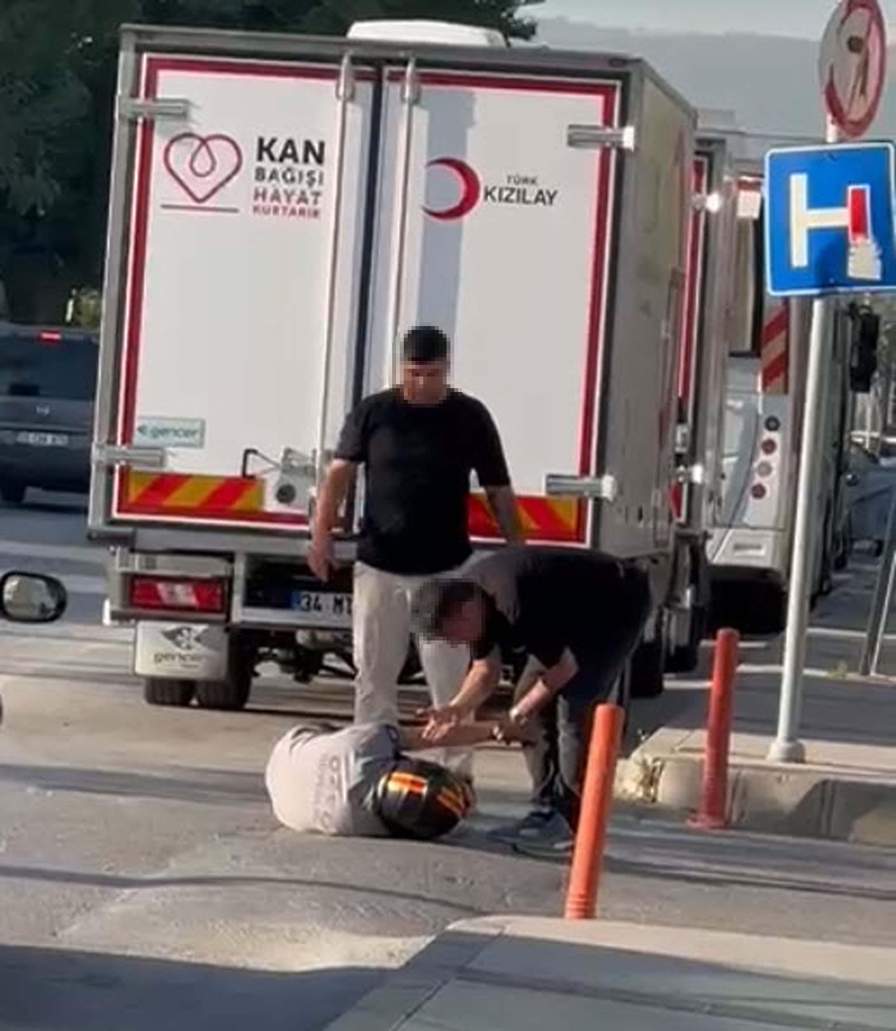 Dinçer Can SONER/ İZMİR, (DHA)- İZMİR'in Bayraklı ilçesinde motosiklet sürücüsü A.P.'nin 2 kişi tarafından darbedildiği anlar cep telefonu ile kaydedildi.