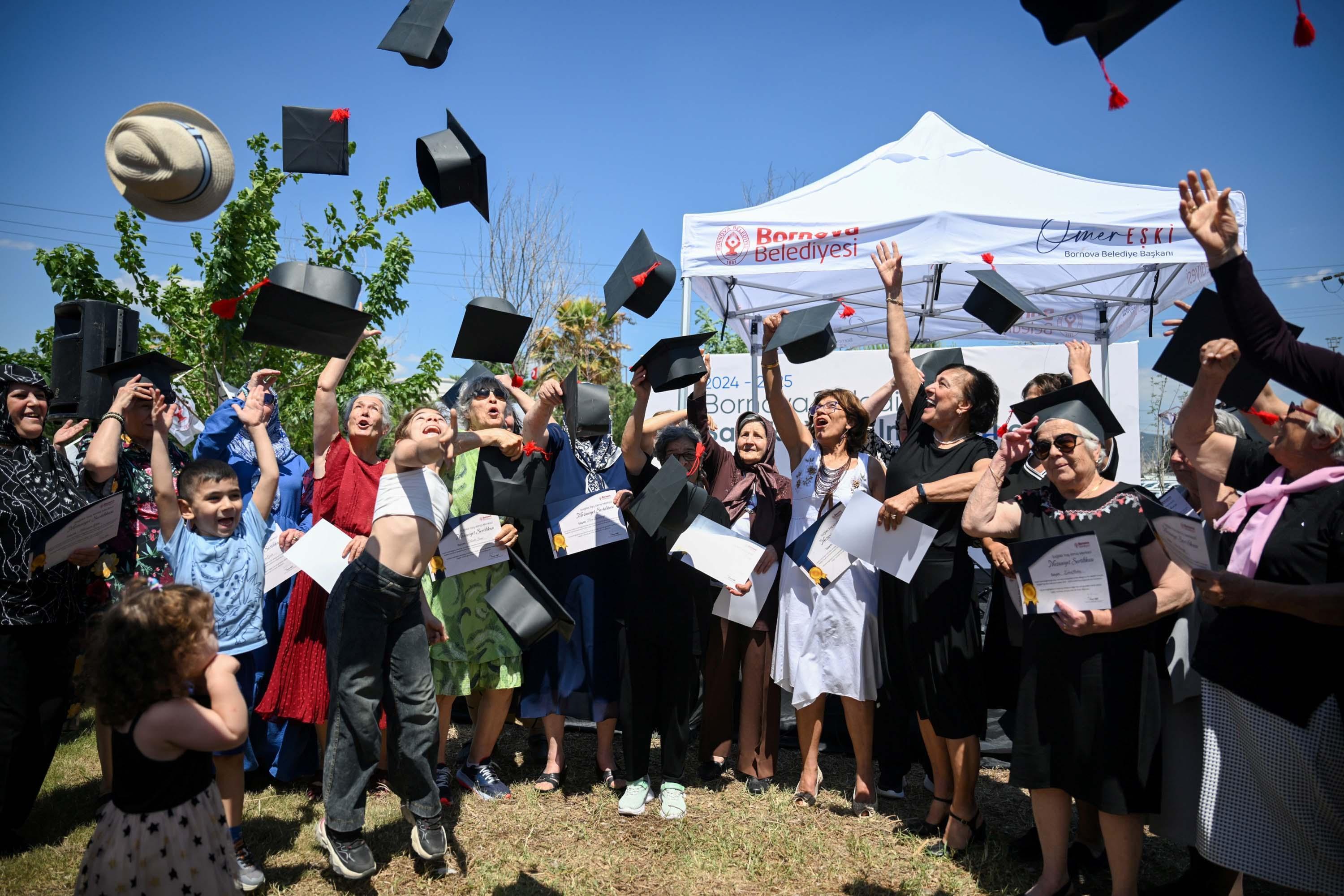 İZMİR,(DHA)-İZMİR'in Bornova Belediyesi Sağlıklı Yaş Alma Merkezi, ilk mezunlarını düzenlenen törenle verdi. 60 yaş üstü Bornovalılar keplerini coşkuyla havaya atarken, Başkan Ömer Eşki " Gerçekten çok pozitifsiniz. Aranıza giren biri mutsuz olamaz" dedi.