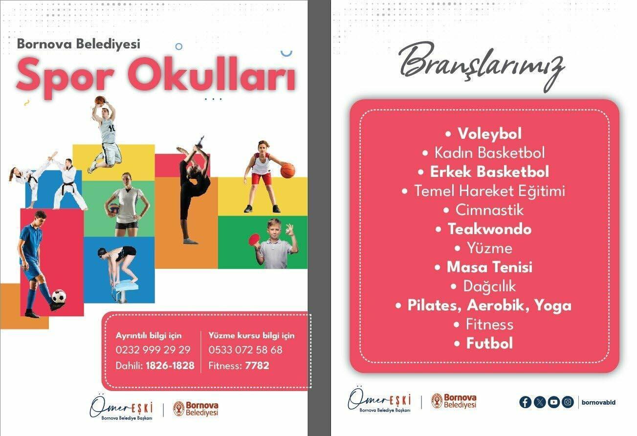 Bornova Belediyesi'nin 1 Temmuz ile 1 Eylül arasında voleybol, basketbol, futbol, jimnastik, tekvando, masa tenisi ve yüzme olmak üzere 7 branşta eğitim verilecek spor okulları için başvurular 24 Haziran'da başlayacak. 2 ay sürecek spor okullarının kayıtları Bornova Belediyesi'nin resmi internet sitesi üzerinden on-line olarak alınacak.