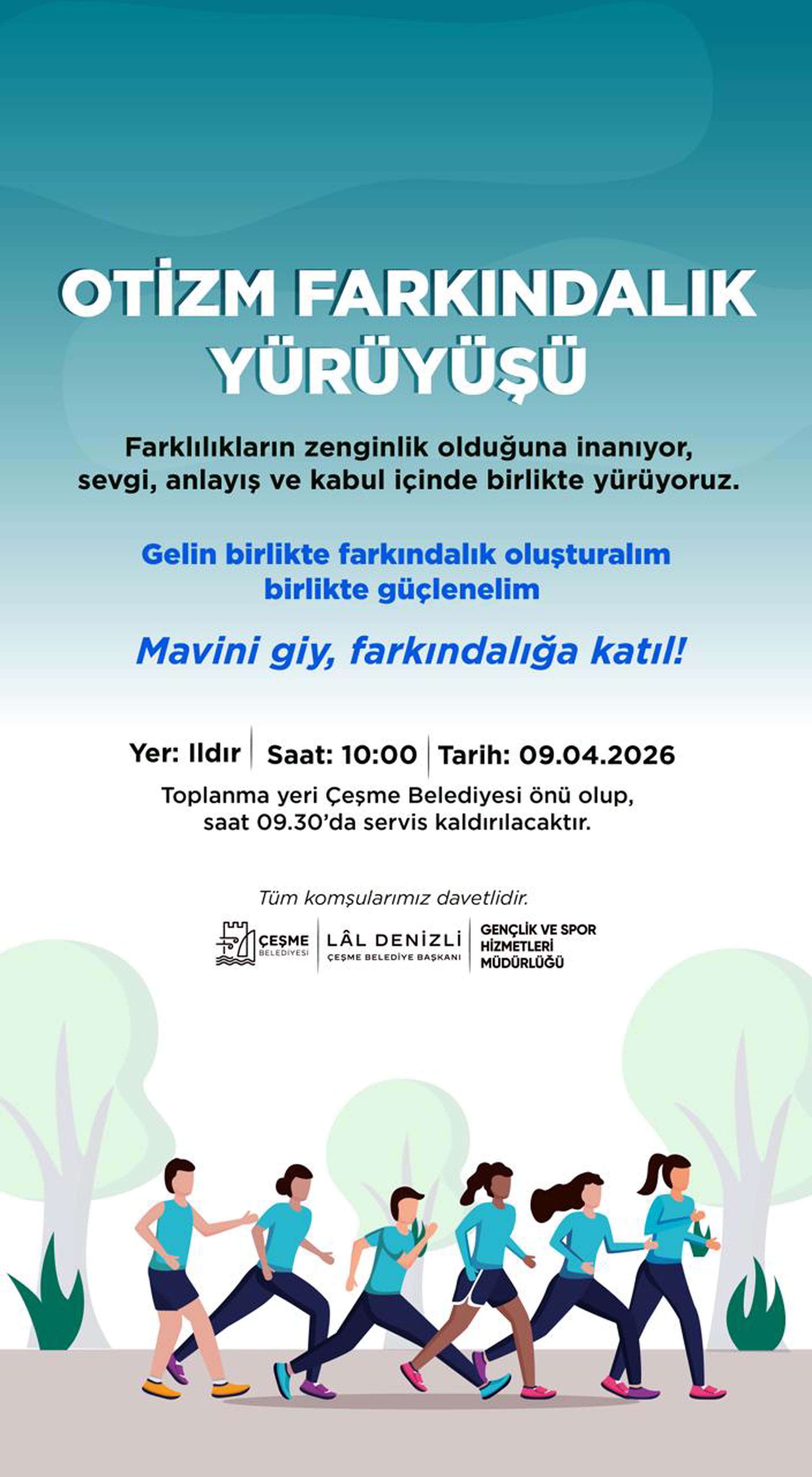 Çeşme Belediyesi, otizm konusunda toplumsal farkındalığı artırmak amacıyla etkinlik düzenlenecek. Çeşme Belediyesi Gençlik ve Spor Hizmetleri Müdürlüğü koordinasyonunda gerçekleştirilecek etkinlik 9 Nisan'da Ildır'da gerçekleştirilecek 'Otizm Farkındalık Yürüyüşü' ile sevgi, anlayış ve kabulün önemine dikkat çekilecek. Farklılıkların zenginlik olduğu anlayışıyla düzenlenen yürüyüşte, otizme yönelik toplumsal duyarlılığın artırılması ve kapsayıcı bir yaşam kültürünün güçlendirilmesi hedeflendiği belirtildi. Tüm Çeşmelilerin davetli olduğu etkinlikte katılımcıların, mavi renk giyerek farkındalık mesajını vereceği bildirildi. Yürüyüş, saat 10.00'da Ildır'da başlayacak. Katılım sağlamak isteyen vatandaşlar için Çeşme Belediyesi önünden saat 09.30'da servis kaldırılacak.
