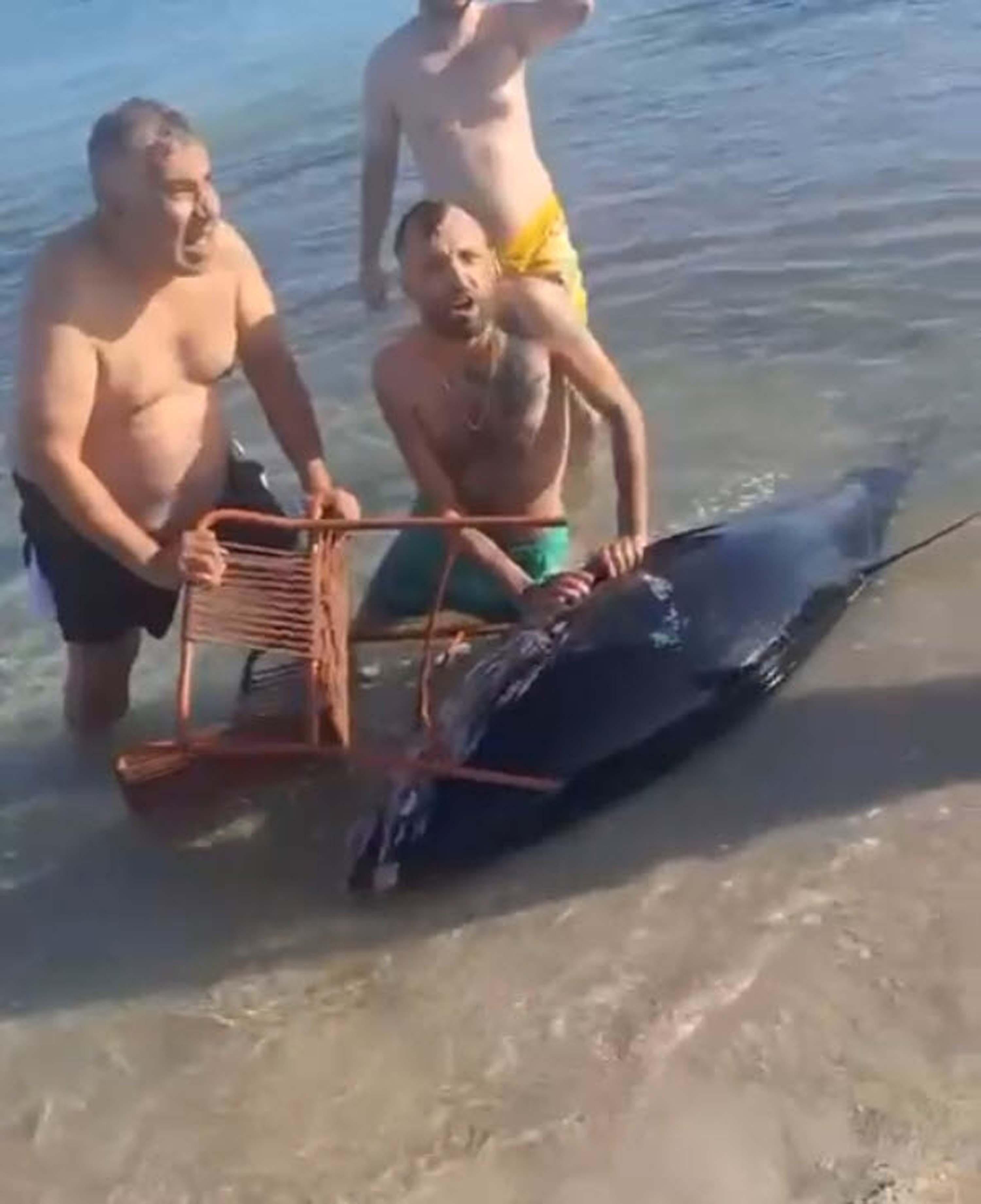 Çeşme ilçesinde, dün kıyıya vuran orkinosu gören plajdaki bazı kişiler, balığı sandalyeyle kıyıya çıkarmaya çalıştı. Sandalyeden kurtulan orkinos, denize geri dönüp gözden kayboldu. O anlar, çevredekiler tarafından cep telefonuyla kayda alındı. Sosyal medyada paylaşılan görüntüler tepkilere neden oldu.