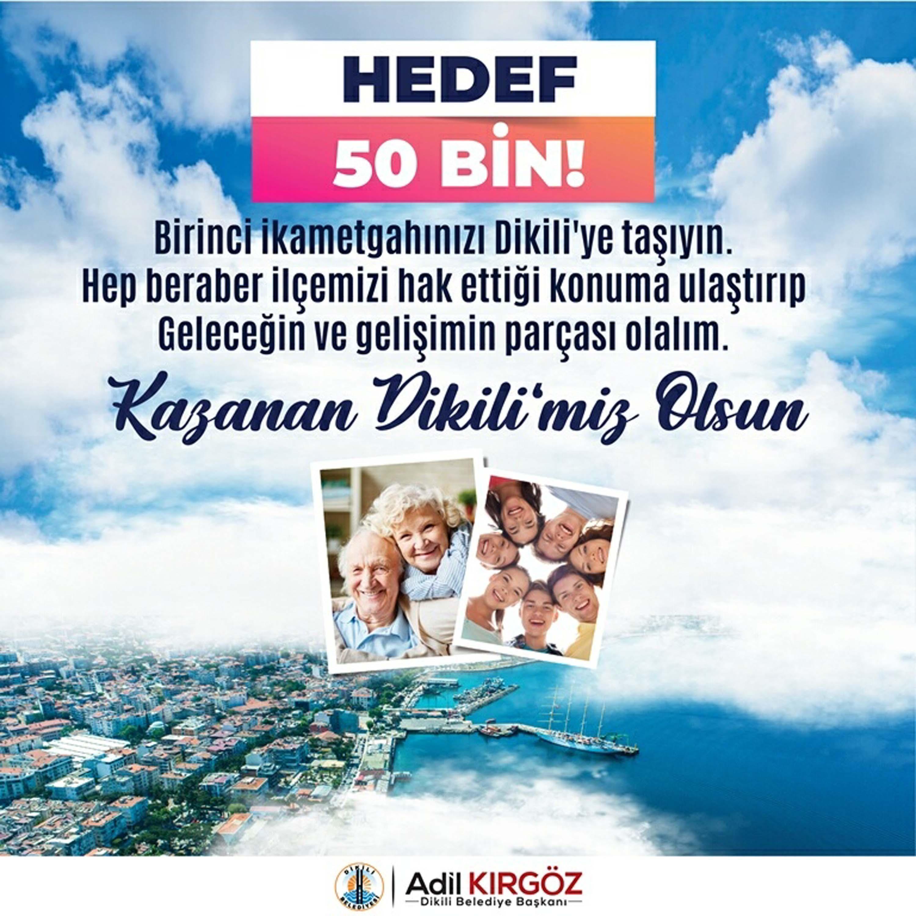 Dikili Belediyesi, ilçede 'Hedef 50 Bin' sloganıyla kampanya başlattı. Kamanya kapsamında, billboardlara afişler asılırken, yazlık sitelerde el ilanları dağıtılmaya başlandı. Sosyal medyadan da kampanyayla ilgili paylaşımlar yapıldı. Kampanyayla ilçeye yerleşip, konut sahibi olanlardan birinci ikametgahlarını Dikili'ye taşımalarının sağlanmasının hedeflendiği bildirildi.