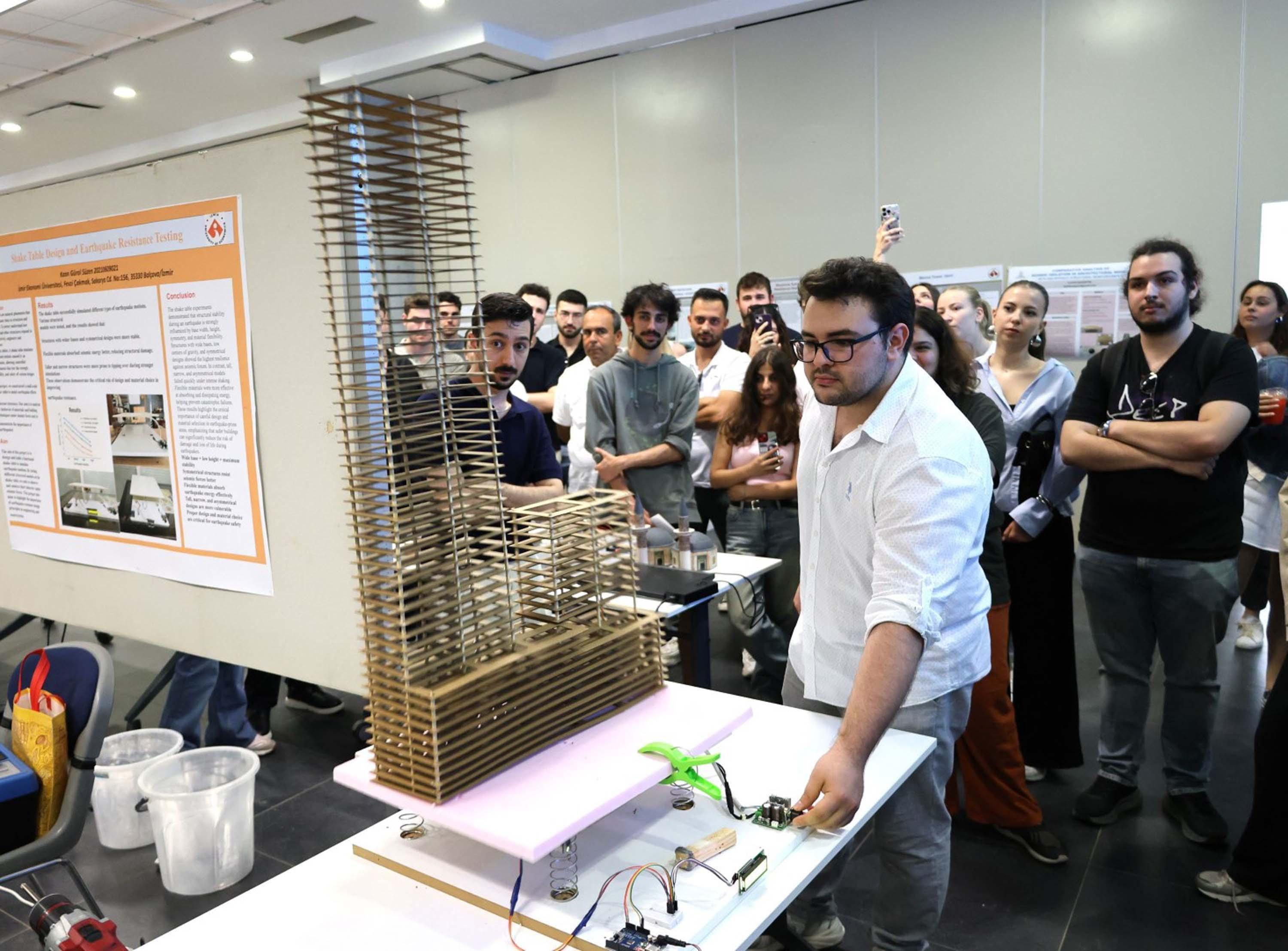 İEÜ İnşaat Mühendisliği ve Mimarlık Bölümü'nde eğitim gören 90 öğrenci, 'Mühendislik Mekaniği II: Dinamik' ve 'Dinamik ve Yapısal Analiz' dersleri kapsamında hazırladıkları çalışmaları yaklaşık üç ayda tamamladı. Profesyonel bir mühendis ve mimar gibi binaları titizlikle inceleyen İEÜ'lü gençler, izlenimlerini rapor haline getirerek akademisyenlerine sundu. Öğrencilerin yaptığı çalışmalar, kampüs içinde yapılan özel bir etkinlikle sergilendi. Sergide ziyaretçiler, farklı yapı sistemlerinin deprem karşısındaki davranışlarını bire bir izleme şansı buldu.