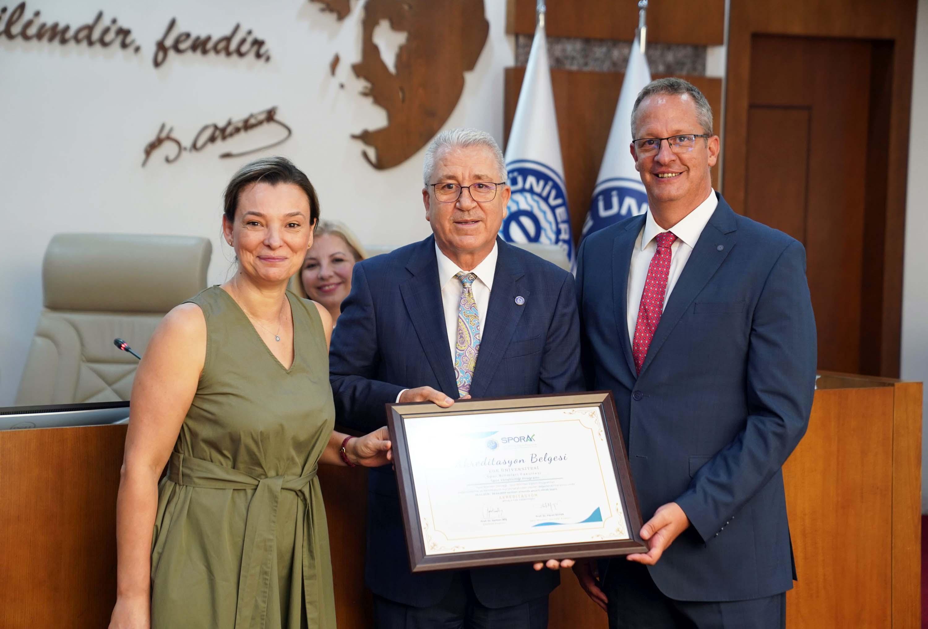 EÜ Spor Bilimleri Fakültesi Spor Yöneticiliği Bölümü de Spor Bilimleri Eğitim Programları Değerlendirme ve Akreditasyon Kurulu (SPORAK) tarafından yapılan değerlendirme sonucunda iki yıl süresince akredite oldu. Bu başarıyla birlikte, daha önce akreditasyon alan Antrenörlük Eğitimi ile Beden Eğitimi ve Spor bölümlerinin ardından, Spor Bilimleri Fakültesinin tüm lisans programları akreditasyon alarak eğitim kalitelerini tescilledi.Ege Üniversitesi Rektörü Prof. Dr. Necdet Budak, senato toplantısında akreditasyon belgesini Spor Bilimleri Fakültesi Dekanı Prof. Dr. Gülbin Rudarlı ve Spor Bilimleri Fakültesi Öğretim Üyesi Prof. Dr. Timuçin Gencer'e takdim etti.