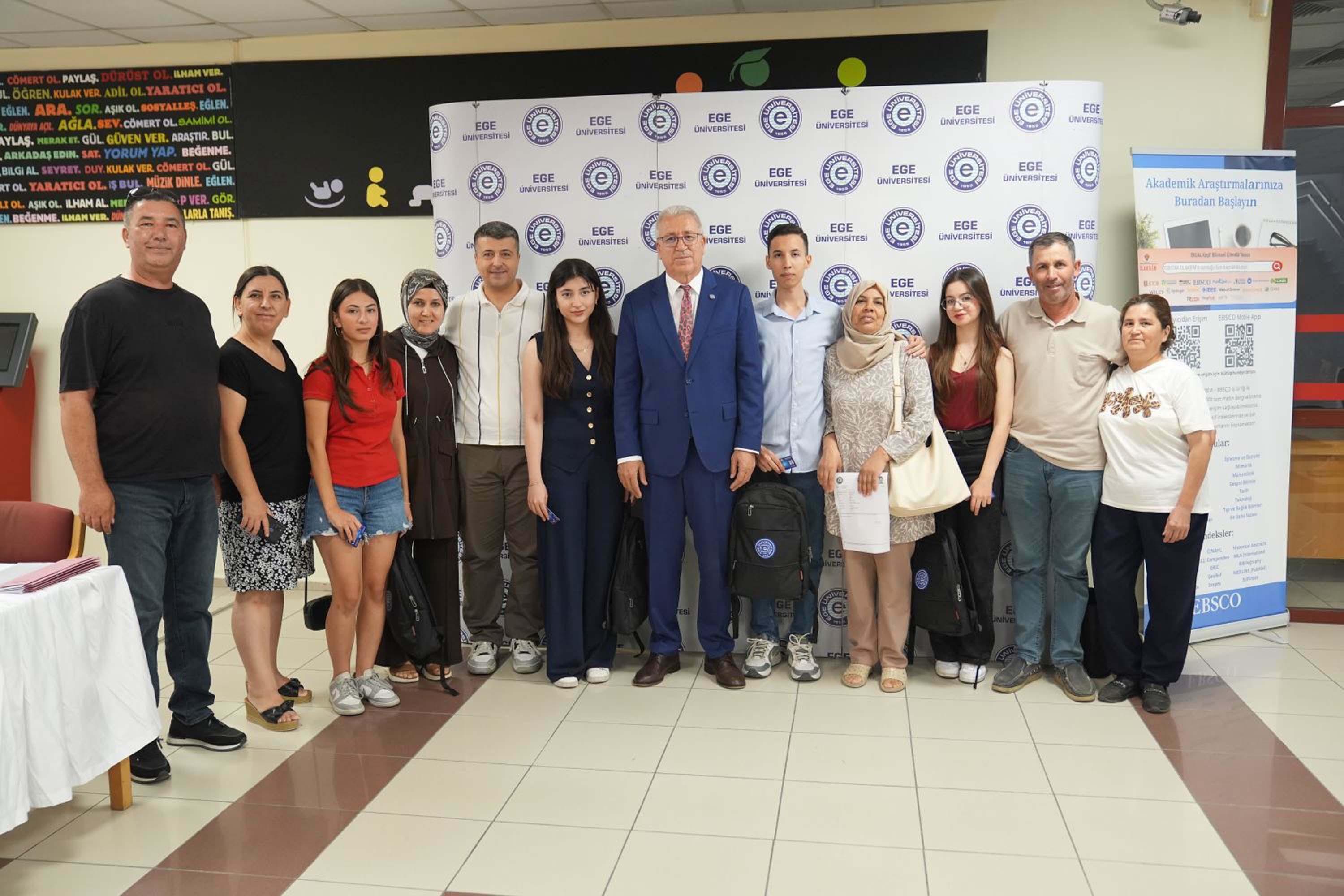 Yeni Egelilere öğrenci kimlik kartlarını teslim ederek başarılar dileyen Rektör Prof. Dr. Budak, "Tam akredite, öğrenci odaklı, sağlık temalı, milli yenilik ödüllü, spor dostu bir üniversite olarak yine yüksek puanlı öğrencilerin tercihlerinde üst sıralarda yer aldık. 2025-2026 eğitim öğretim yılı Ege Üniversitesinde bugün itibarıyla kayıtlarla birlikte başladı. Ailelerimiz ve öğrencilerimizin kayıt heyecanlarına ortak olduk. Ege Üniversitesi ailesine dahil olan tüm öğrencilerimizi gönülden tebrik ediyorum. Ailelerine de teşekkür ediyorum. Bizim amacımız, öğrencilerimizin üniversitemizden iyi bir şekilde eğitim alarak; vatana, millete hayırlı, nitelikli ve donanımlı bireyler olarak mezun olmalarını sağlamaktır. Ailelerimizin içi bu konuda rahat olsun" dedi.