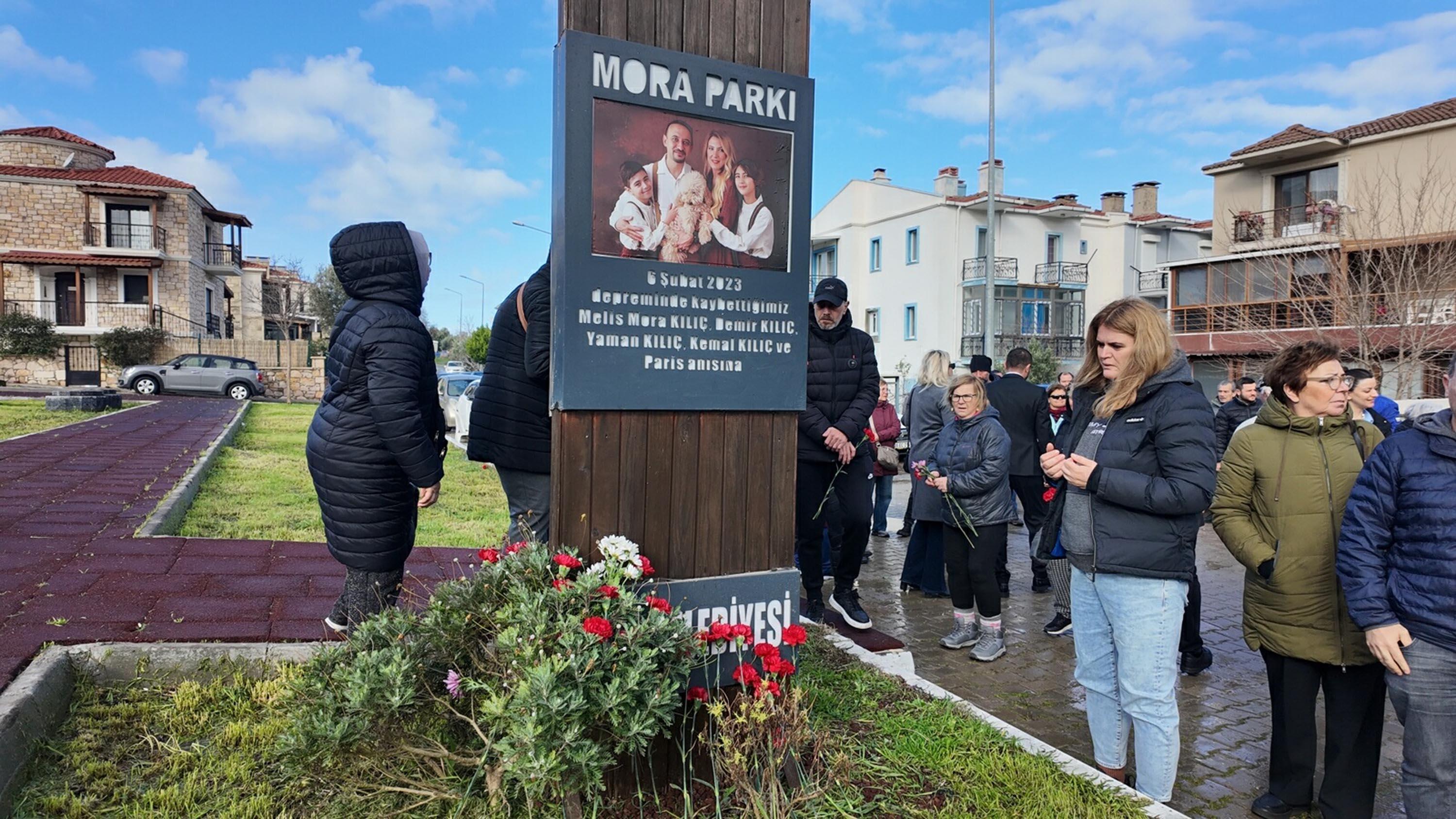 Seyfi GÜL/FOÇA (İzmir), (DHA)- İZMİR'in Foça ilçesinde, 6 Şubat 2023'te 'asrın felaketi' olarak adlandırılan Kahramanmaraş merkezli depremlere Hatay’ın İskenderun ilçesinde yakalanıp, hayatını kaybeden Melis Mora Kılıç (38) ile oğulları Demir (12) ve Yaman Kılıç (9) anıldı. Adlarına yaptırılan parktaki anma töreninin ardından anne ve 2 çocuğunun mezarları ziyaret edilip, lokma döktürüldü.