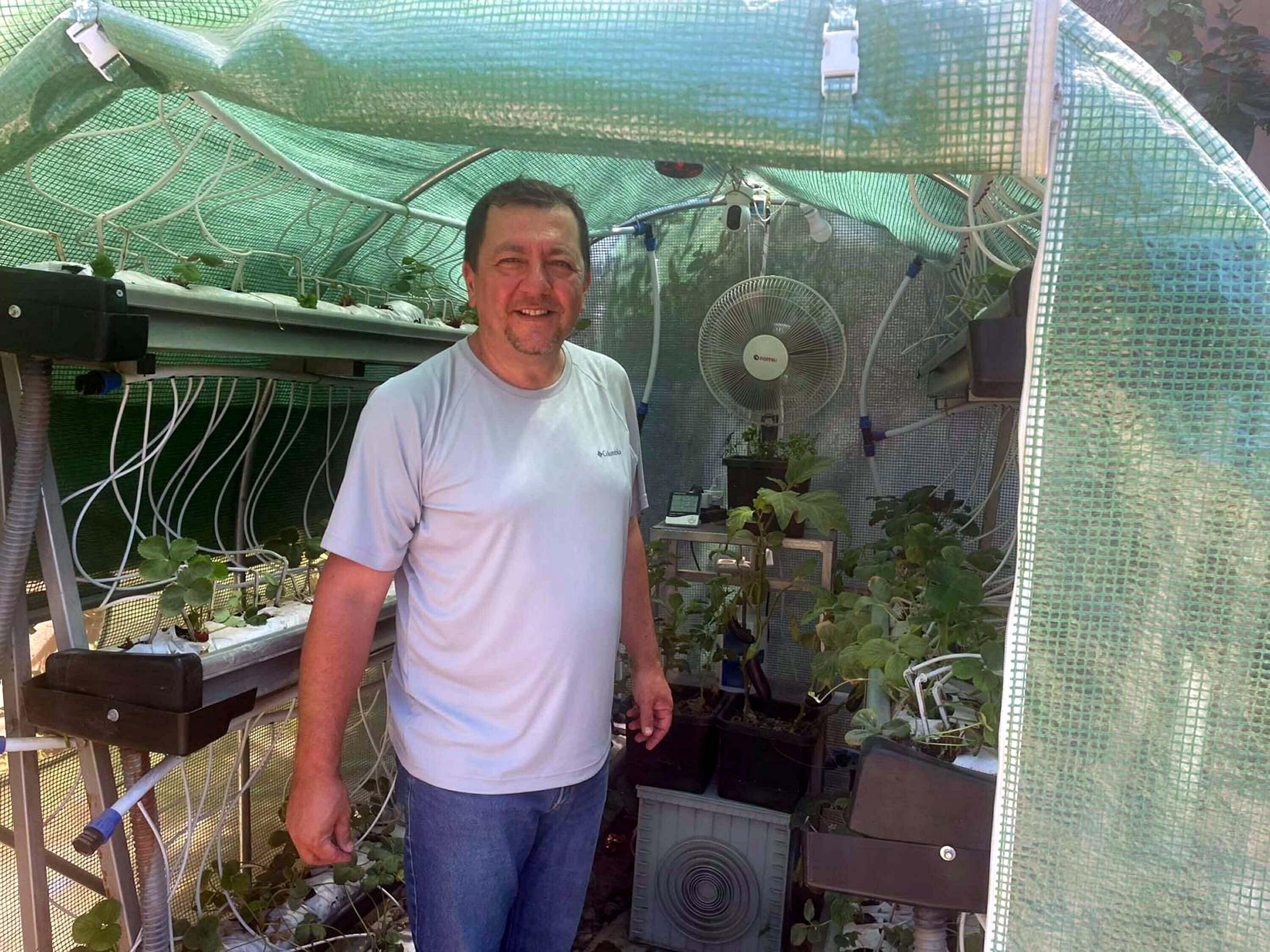 Nevra UÇKAÇ/İZMİR, (DHA)- İZMİR'in Güzelbahçe ilçesindeki evinin bahçesine kuraklık nedeniyle deneme amaçlı 4 metrekare büyüklüğünde sera kuran Prof. Dr. Gökhan Kılıç, çilek, patlıcan, maydanoz ve biber yetiştirmeye başladı. Prof. Dr. Kılıç, "Bu işi büyüterek daha büyük seralar kurmayı planlıyorum. Çünkü ileride sıcaklık daha da artacak. Yaşam standartlarını sürdürebilmek için buna ihtiyaç var. Bence bunu herkes öğrenmeye mecbur kalacak" dedi.