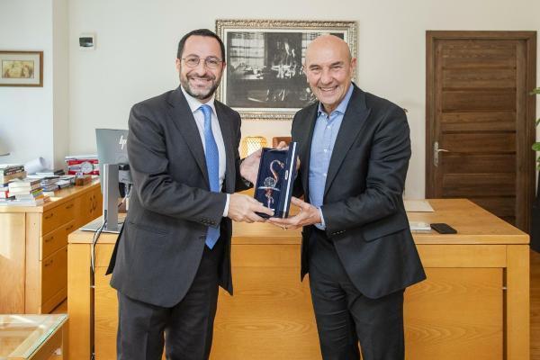 Görev süresi tamamlanan İtalya'nın İzmir Konsolosu Valerio Giorgio, İzmir Büyükşehir Belediye Başkanı Tunç Soyer'e veda ziyaretinde bulundu. Konsolosun kentte güzel hizmetlerde bulunduğunu belirten Soyer, "Sizinle çalışmak güzeldi. İzmir'de unutulmayacak izler bıraktınız. İki ülke arasındaki ilişkileri güçlendirdiniz. Kentteki çalışmalarınız çok kıymetli. Her zaman sizleri İzmir'de ağırlamaktan mutluluk duyacağız" dedi.