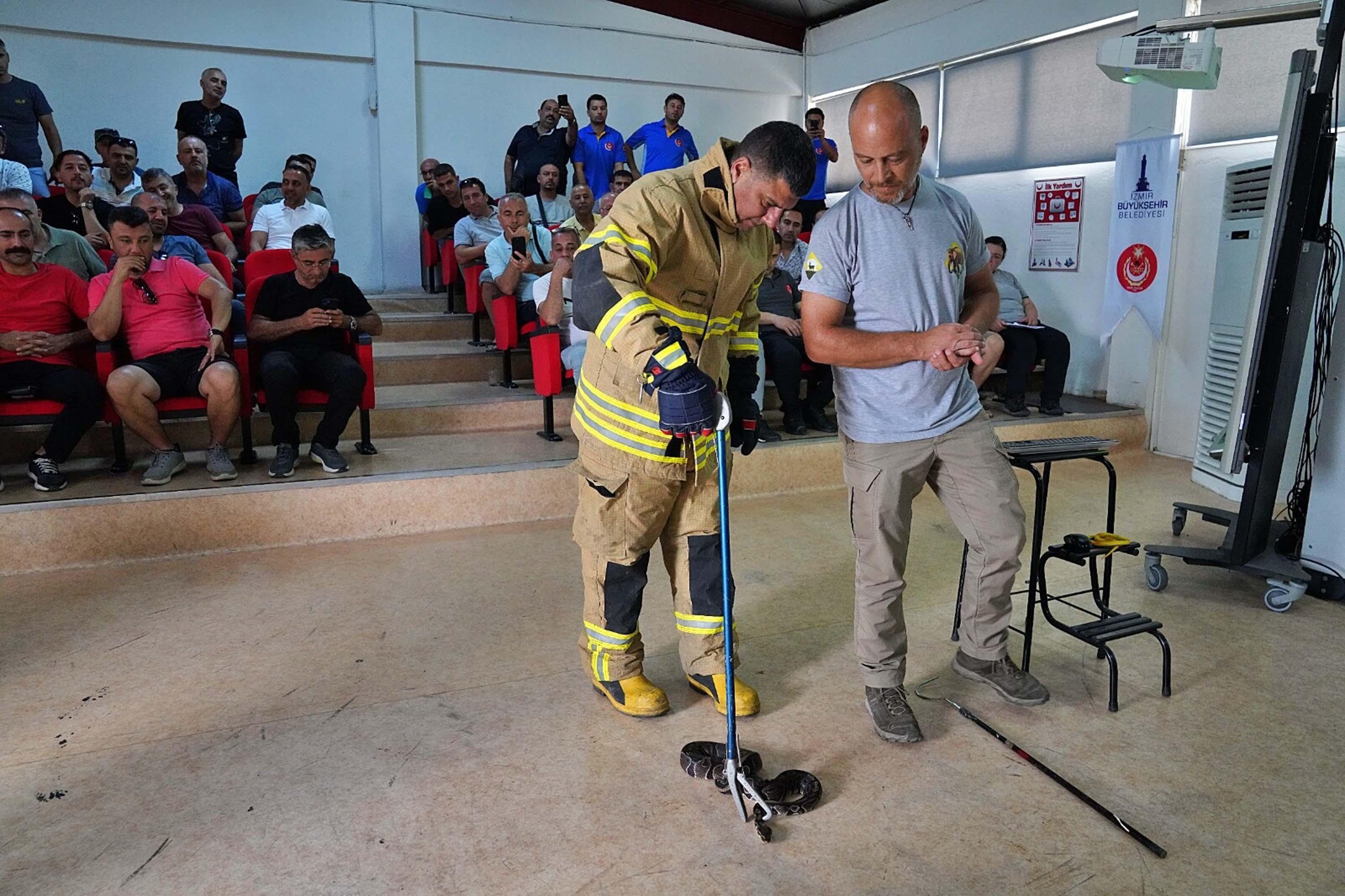 İZMİR'de itfaiye ekiplerine yılan yakalama konusunda eğitim verildi. Ekiplere, zehirli ve zehirsiz bir yılan türüyle karşılaştıklarında müdahale yöntemlerini uygulamalı olarak anlatıldı.
