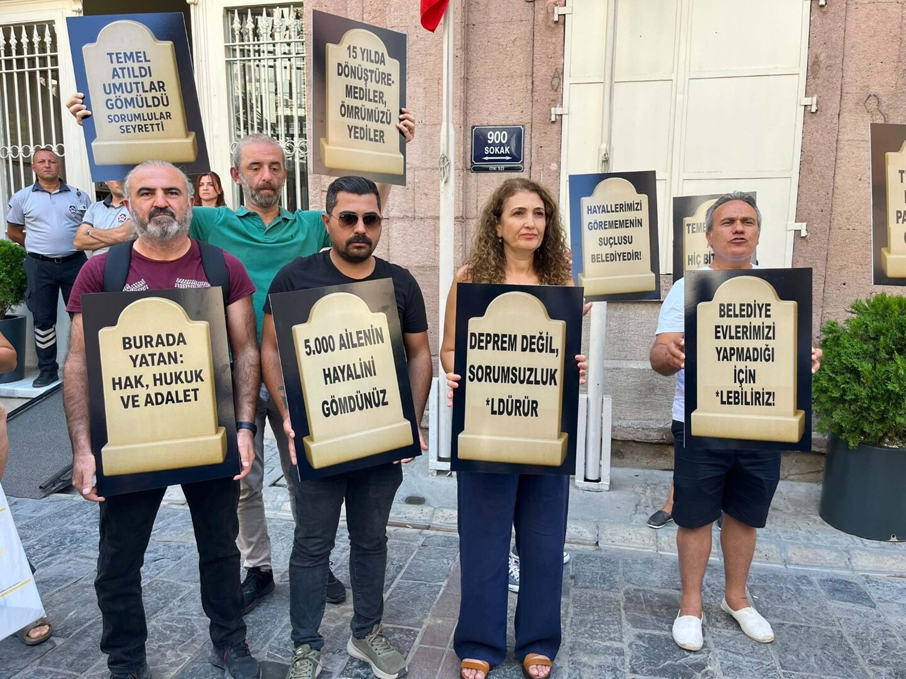 İzmir’de kentsel dönüşüm projelerinde yaşanan aksaklıklar nedeniyle mağduriyet yaşayan kooperatif üyeleri, İzmir Büyükşehir Belediyesi Egemenlik Binası önünde basın açıklaması yaptı. Ödemelerini yaptıkları depreme dayanıklı evlerini istediklerini belirtip, İzmir Büyükşehir Belediye Başkanı Cemil Tugay’a seslenen mağdurlar, ellerinde tuttukları mezar taşı dövizlerini bina önüne bıraktı. Dövizlerde 'İnşaat temeli diye kazdılar paramızı gömdüler', 'Deprem değil, sorumsuzluk öldürür', '5000 ailenin hayalini gömdünüz', 'Burada yatan: Hak, Hukuk ve Adalet' ifadeleri dikkat çekti.