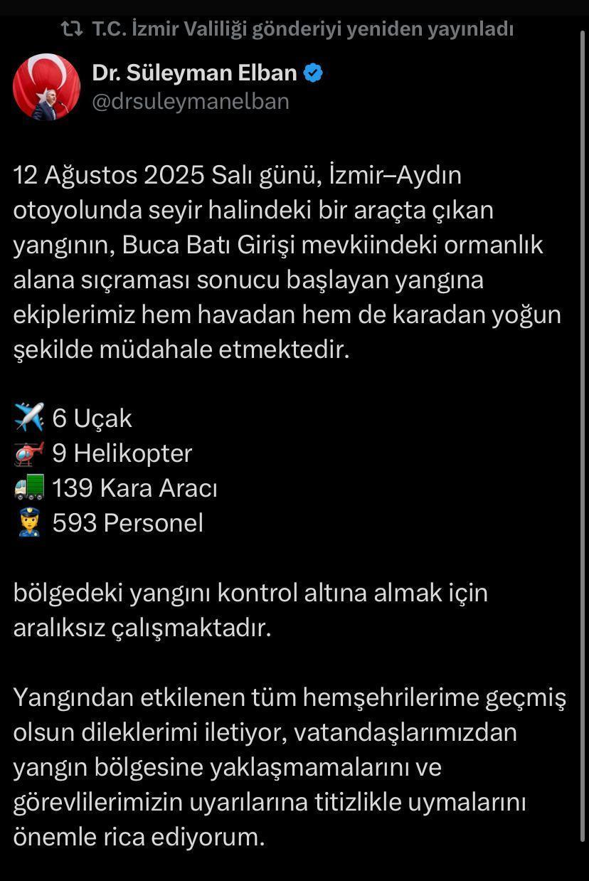 İzmir Valisi Süleyman Elban orman yangınıyla ilgili sosyal medyadan açıklama yaptı. Vali Elban, “12 Ağustos 2025 Salı günü, İzmir-Aydın otoyolunda seyir halindeki bir araçta çıkan yangının, Buca Batı Girişi mevkiindeki ormanlık alana sıçraması sonucu başlayan yangına ekiplerimiz hem havadan hem de karadan yoğun şekilde müdahale etmektedir. 6 uçak, 9 helikopter, 139 kara aracı, 593 personel bölgedeki yangını kontrol altına almak için aralıksız çalışmaktadır. Yangından etkilenen tüm hemşehrilerime geçmiş olsun dileklerimi iletiyor, vatandaşlarımızdan yangın bölgesine yaklaşmamalarını ve görevlilerimizin uyarılarına titizlikle uymalarını önemle rica ediyorum” ifadelerini kullandı.