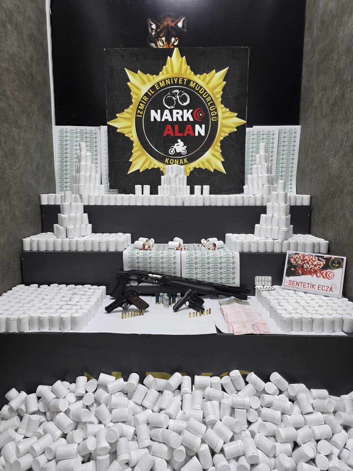 Konak İlçe Emniyet Müdürlüğü'ne bağlı Narko Alan ekipleri, uyuşturucu madde imal ve ticaretine yönelik yürütülen çalışmalar kapsamında, Hilal Mahallesi'nde belirlenen adreslere dün operasyon düzenledi. Adreslerde yapılan aramalarda; 108 bin 492 sentetik ecza (hap), pompalı tüfek, 2 ruhsatsız tabanca ve silahlara ait mühimmat ile 75 bin 100 lira ele geçirildi. Operasyonda gözaltına alınan N.P. (28), F.B. (29) ve N.K. (41) hakkında adli işlem başlatıldı. (DHA)