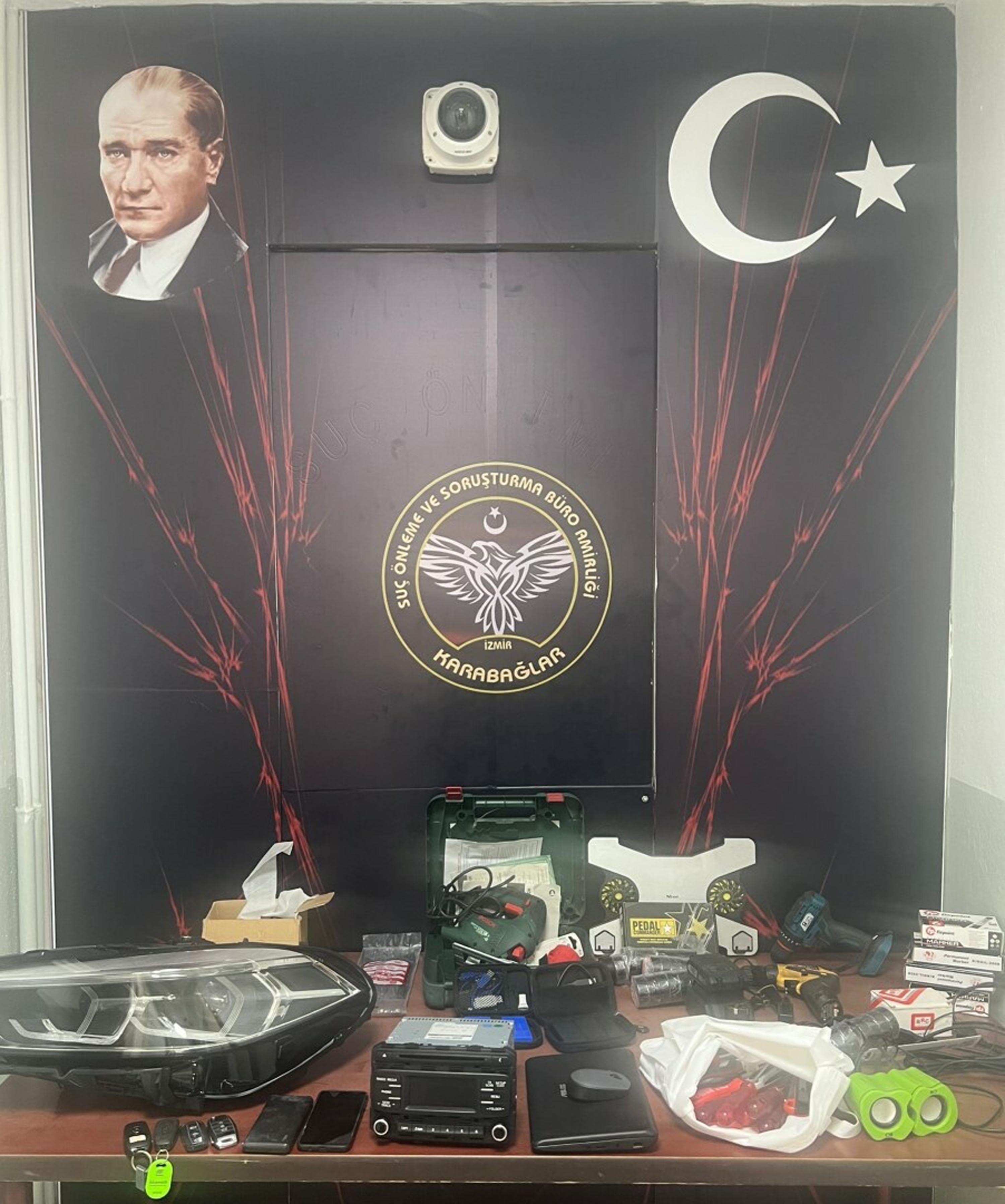 İzmir İl Emniyet Müdürlüğü Karabağlar İlçe Emniyet Müdürlüğü Suç Önleme ve Soruşturma Büro Amirliğine bağlı ekipler, 3 ayrı iş yerinden hırsızlık yapıldığına dair ihbar aldı. Bugün alınan ihbarları değerlendiren ekipler 36 mobese kamerasını inceleyerek B.K. ve U.İ.Ö. isimli iki şüpheliyi tespit etti. Tespit edilen şüphelilerin adresine operasyon düzenleyen ekipler, yaptıkları aramalarda çalıntı olduğu tespit edilen 2 dizüstü bilgisayar, 3 bin 500 TL nakit para, 5 cep telefonu, 1 tablet, 6 harici bellek, 2 şarjlı matkap, 1 parfüm, 1 seyyar lamba, 1 sırt çantası, 1 arıza tespit cihazı, 1 oto teyp, 1 görüntü kayıt cihazı, 4 araç anahtarı, 1 güneş gözlüğü ve 1 araç farı ele geçirdi, 2 hırsız gözaltına alındı.