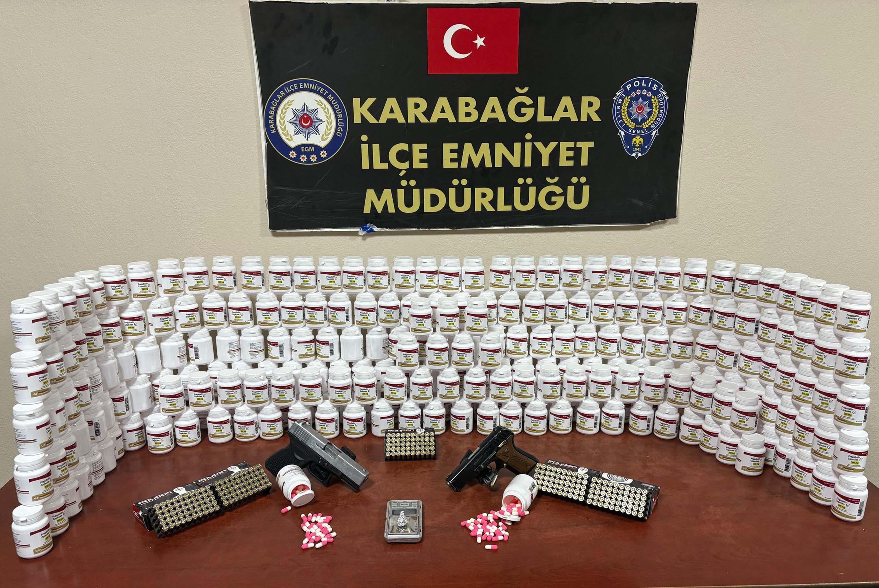 Karabağlar Emniyet Müdürlüğü'ne bağlı Suç Önleme ve Soruşturma Büro Amirliği ekipleri, M.A.'nın ilçede uyuşturucu sattığını belirledi. Hakkında 'Uyuşturucu satmak ve kullanmak' ve 'Hırsızlık' başta olmak üzere birçok suç kaydı olan M.A.'nın yakalanması için dün harekete geçildi. Şüphelinin uyuşturucuyu sakladığı iş yerine operasyon düzenlendi. Söz konusu adreste yapılan aramada 13 bin 776 sentetik hap, ruhsatsız 2 tabanca, 500 mermi, 1 hassas terazi ve 0,52 gram esrar ele geçirildi. Gözaltına alınan şüphelinin polisteki işlemlerinin sürdüğü bildirildi. (DHA)